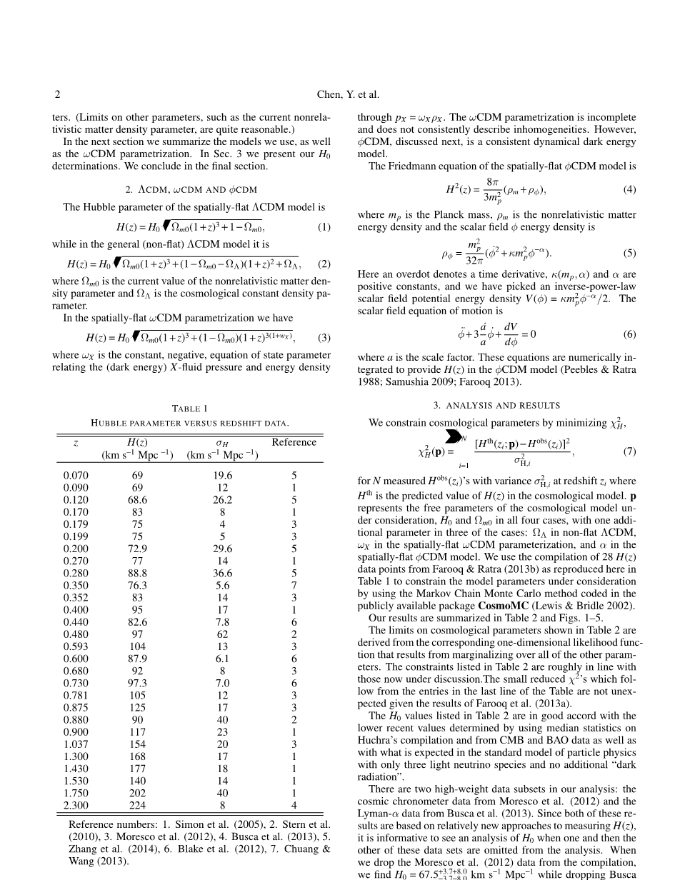 为了确定H0,我们使用两种不同的暗能量模型and;CDM(Peebles于1984)和CDM(Peebles和Ratra于1988;Ratra和Peebles于1988)分析了Farooq和Ratra(2013b)中的h(z)数据,并在表1中复制了这些数据,以及暗能量的不完整但流行的参数化CDM。在所有情况下,我们都从一维似然度测量H0,该似然度由所有其他参数的边缘化确定。(对其他参数的限制,如当前的非相对论物质密度参数,是相当合理的。)