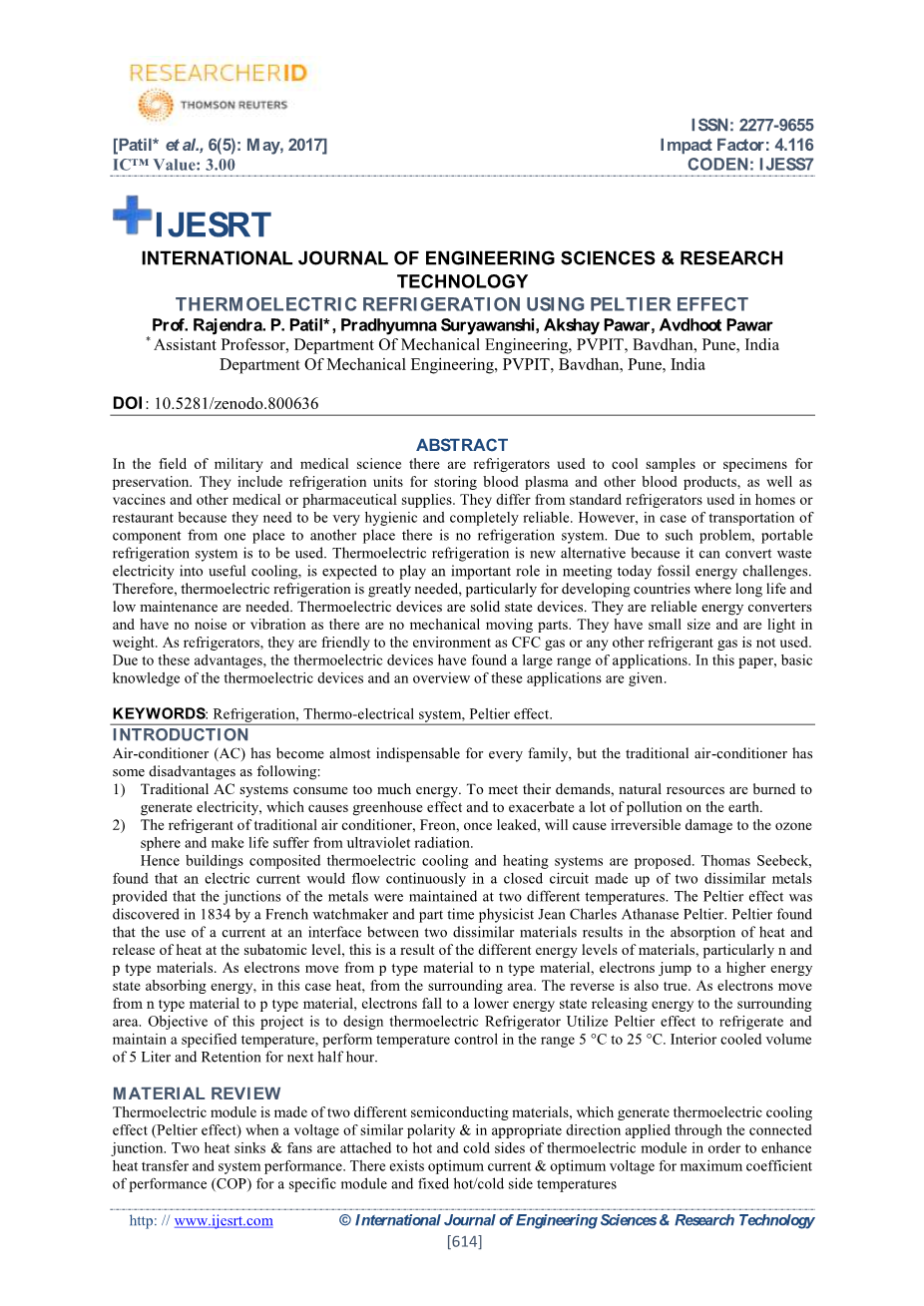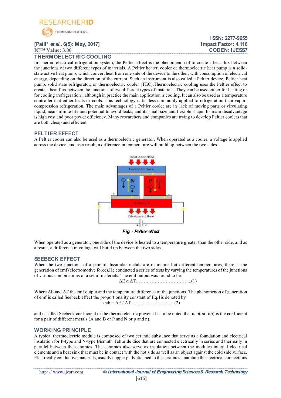 在军事和医学科学领域,有用于冷却保存样品或标本的冰箱。它们包括用于储存血浆、血液制品、疫苗、医疗或药品用品的制冷装置。它们与家庭或餐厅所使用的普通冰箱不同,因为它们需要非常的卫生并且完全可靠。但是在将部件从一个地方运输到另一个地方的情况下,没有制冷系统。对于这种问题,将使用便携式制冷系统来解决。热电制冷是一种新的替代方案,因为它可以将废电转化为有用的冷却方式,且有望在应对今天的化石能源挑战中发挥重要作用。因此非常需要热电制冷,特别是需要长寿命和低费维护的发展国家。热电装置是固态装置。因为没有机械运动部件,所以它们是可靠的能量转换器且没有噪音或振动。它们体积小,重量轻。作为冰箱,因为它们不使用CFC气体(氟利昂,又名氟里昂,名称源于英文Freon,它是一个由美国杜邦公司注册的制冷剂商标。在中国,氟利昂定义存在分歧,一般将其定义为饱和烃的卤代物的总称,按照此定义,氟利昂可分为CFC、HCFC、HFC等4类;但有些学者将氟利昂定义为CFC制冷剂。氟利昂在常温下都是无色气体或易挥发液体,无味或略有气味,无毒或低毒,化学性质稳定,但是CFC类制冷剂破坏大气臭氧层)或任何其他制冷剂气体,所以对环境友好。由于这些优点,热电装置已经得到了广泛的应用。在本文中,给出了热电装置的基本知识和这些应用的概述。(关键词:制冷,热电系统,Peltier效应)
