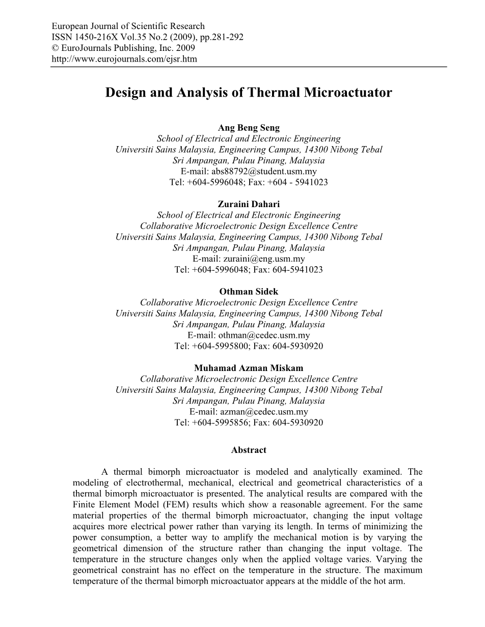 在这项研究中,提出了分析和有限元建模来解释设计的热双压电晶片微致动器的行为.商用MEMS软件Coventorwarereg;2006用于FEM建模和仿真.本研究的目的是分析热双压电晶片微致动器的预期偏转.建立了某些重要参数的关系,如施加电压和热微致动器的几何尺寸.此外,还确定了这些参数对热双压电晶片微致动器的电热和电特性的影响.