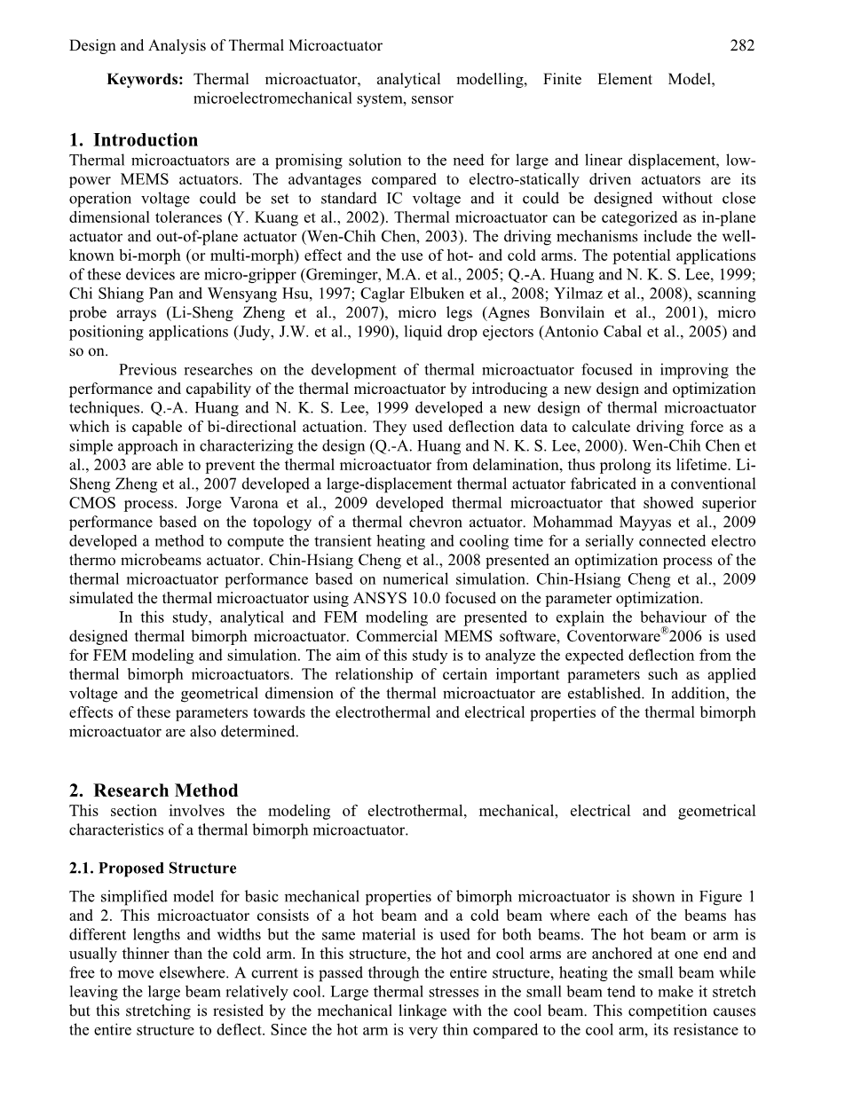 以往对热微致动器发展的研究主要集中在通过引入新的设计和优化技术来提高热微致动器的性能和性能.Q.-A. Huang和N. K. S. Lee 1999年开发了一种新的热微致动器设计,它能够进行双向驱动.他们使用偏转数据来计算驱动力,作为表征设计的简单方法(Q.-A. Huang和N.K. S. Lee,2000).2003年,Chen-Chih Chen等人能够防止热微致动器分层,从而延长其寿命. Li-Sheng Zheng等人,2007年开发了一种采用传统CMOS工艺制造的大位移热致动器. Jorge Varona等人,2009年开发的热微致动器,基于热V形执行器的拓扑结构,表现出优异的性能.Mohammad Mayyas等人,2009年开发了一种计算串联电热微光束执行器的瞬态加热和冷却时间的方法. Chin-Hsiang Cheng et al.2008年提出了一种基于数值模拟的热微致动器性能优化过程.Chin-Hsiang Cheng et al.,2009年使用ANSYS 10.0模拟了热微致动器,重点是参数优化.