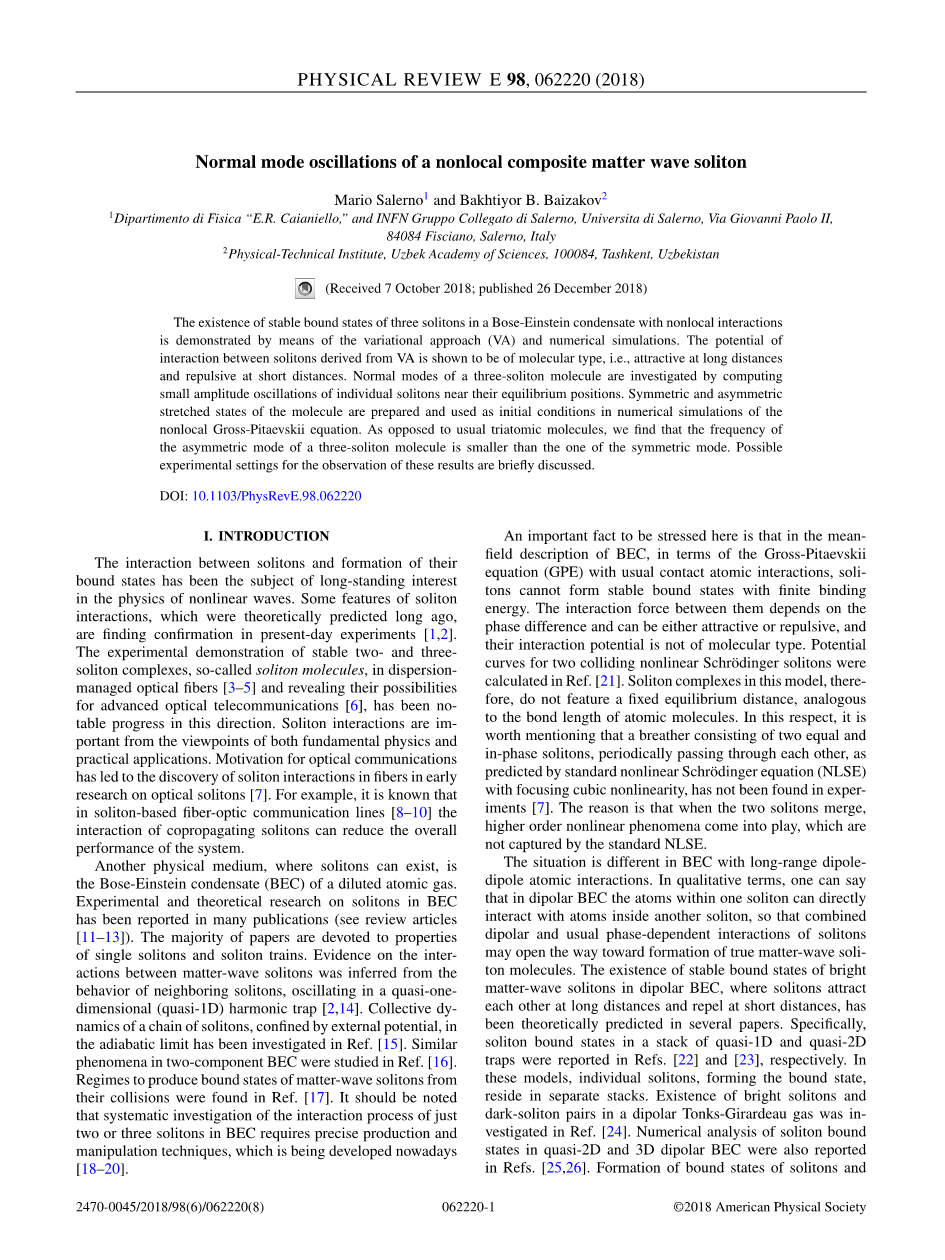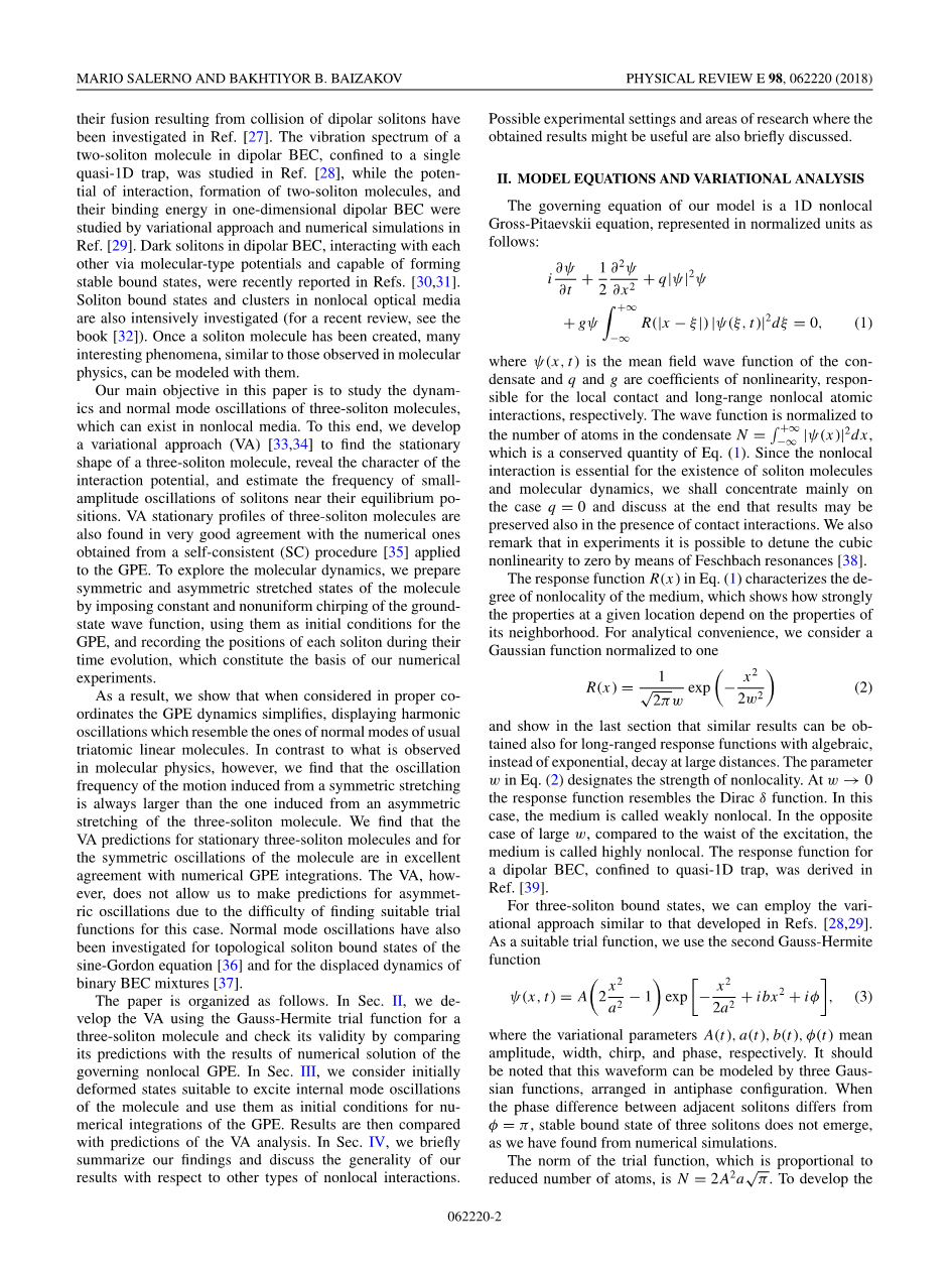 本文的结构如下。在第二部分中,我们使用Gauss-Hermite试验函数开发VA用于三孤子分子,并通过将其预测与控制非局部GPE的数值解的结果进行比较来检查其有效性。在第三部分中,我们首先考虑适合激发分子内部模式振荡的变形状态,并将它们用作GPE数值积分的初始条件。然后将结果与VA分析的预测进行比较。在第四部分,我们简要总结了我们的发现,并讨论了我们的结果与其他类型的非局部相互作用的一般性。还简要讨论了可能的实验设置和获得的结果可能有用的研究领域。