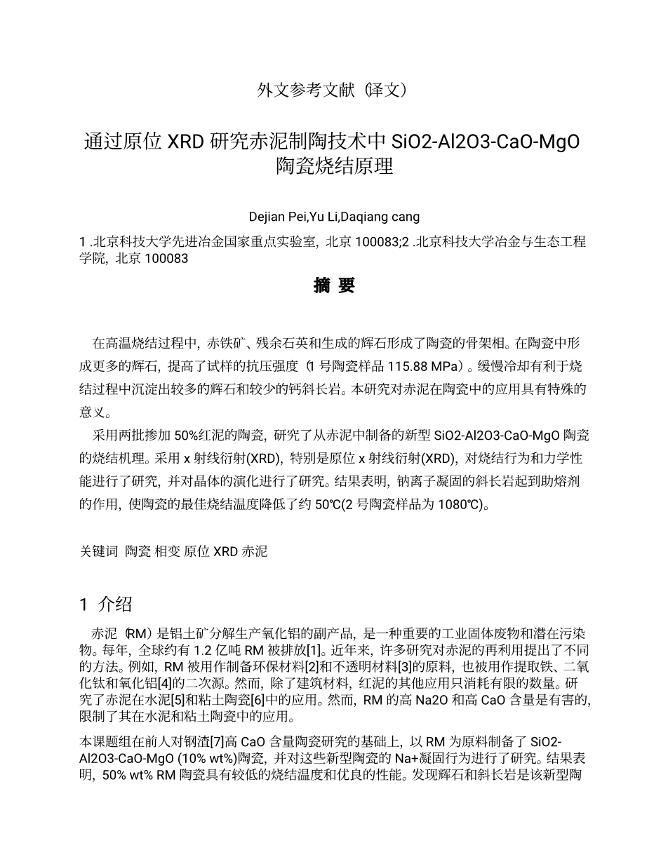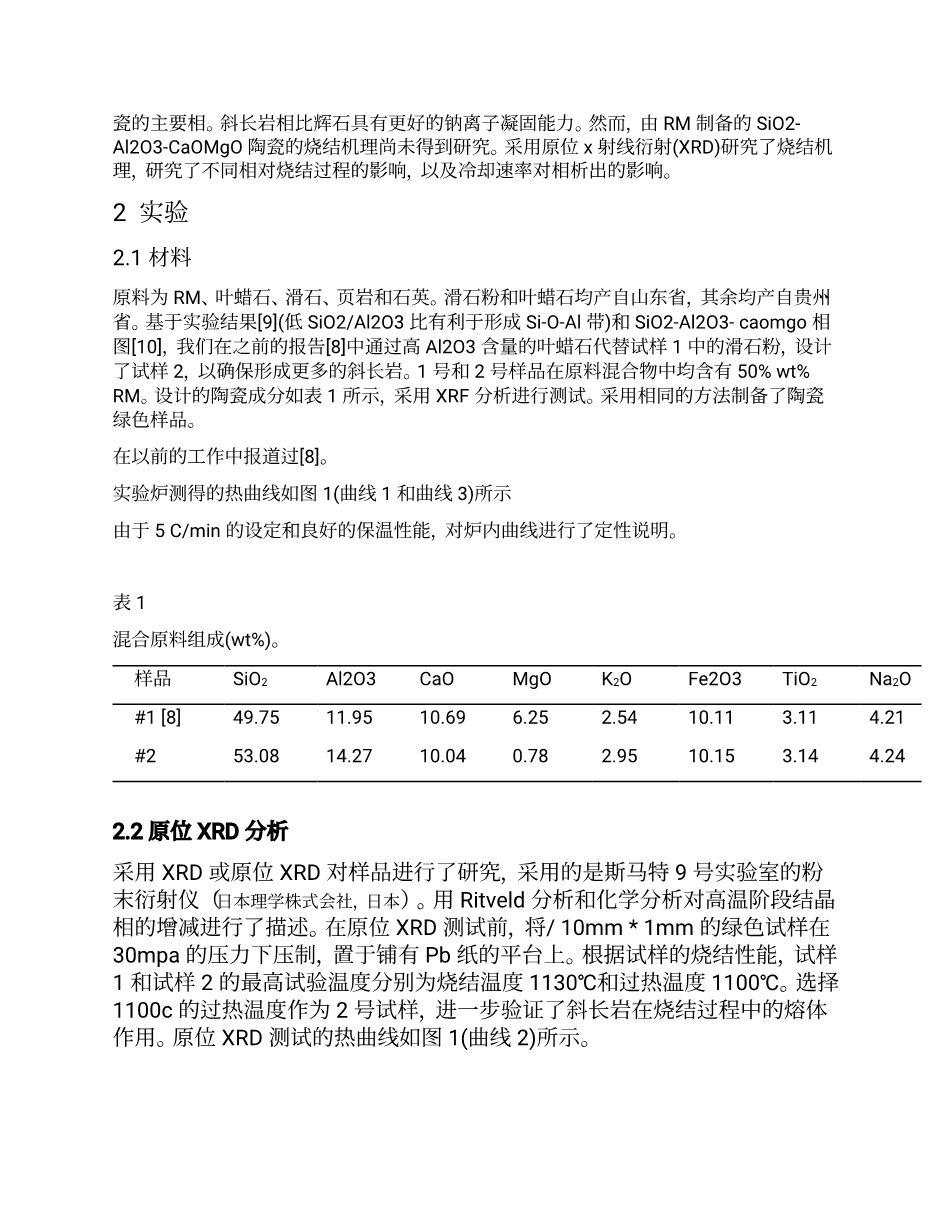 pyroxene. However, the sintering mechanism of SiO2-Al2O3-CaOMgO ceramics derived from RM has not been investigated yet. In this paper, the sintering mechanism was studied using in situ Xray diffraction (XRD) to investigate the effects of different phases on the sintering process, and the effects of cooling rate on phase precipitation.