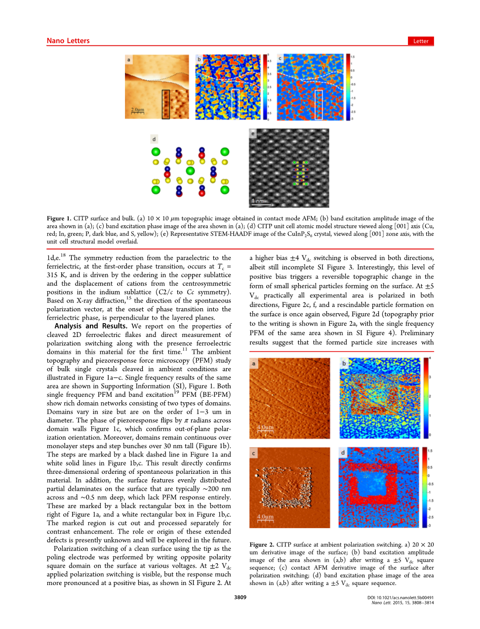 本文研究了硫代磷酸铜铟CuInIIIP2X6(CITP)的铁电性能,阐述了尺寸效应和铁电相稳定性目前可达到的极限。CITP及其硒取代衍生物CuMIIIP2X6(M=Cr,In;X=S,Se)已被广泛研究,使用中子散射、拉曼和其他散装技术;然而,这是该结构局部铁电勘探的唯一报告。CITP结构由硫框架定义,其中八面体空隙中充满铜和铟的阳离子,而P-P对在互连的硫笼中形成三角形结构,如图1d,e所示。在一阶相变时,从顺电到亚铁电的对称性约减发生在TC=315K,并由铜亚晶格中的有序性和铟亚晶格中轴对称位置的阳离子位移驱动。根据X射线衍射,在相转变为亚铁电相时,自发极化矢量的方向垂直于层状平面。