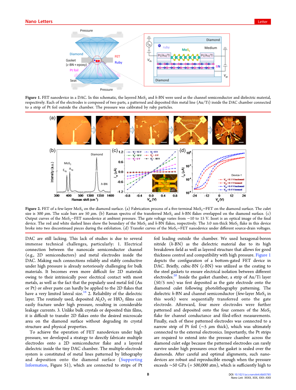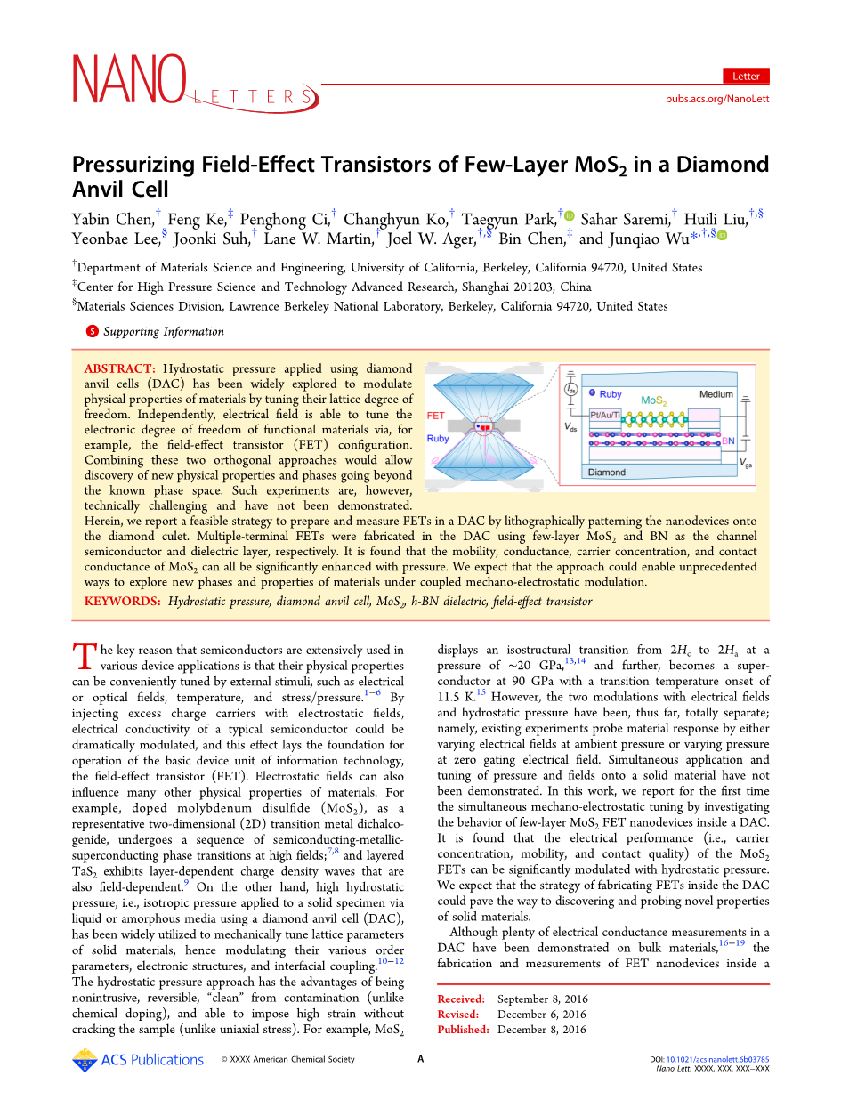 关键词 静水压,金刚石压砧,MoS2,h-BN介质,场效应晶体管等。
