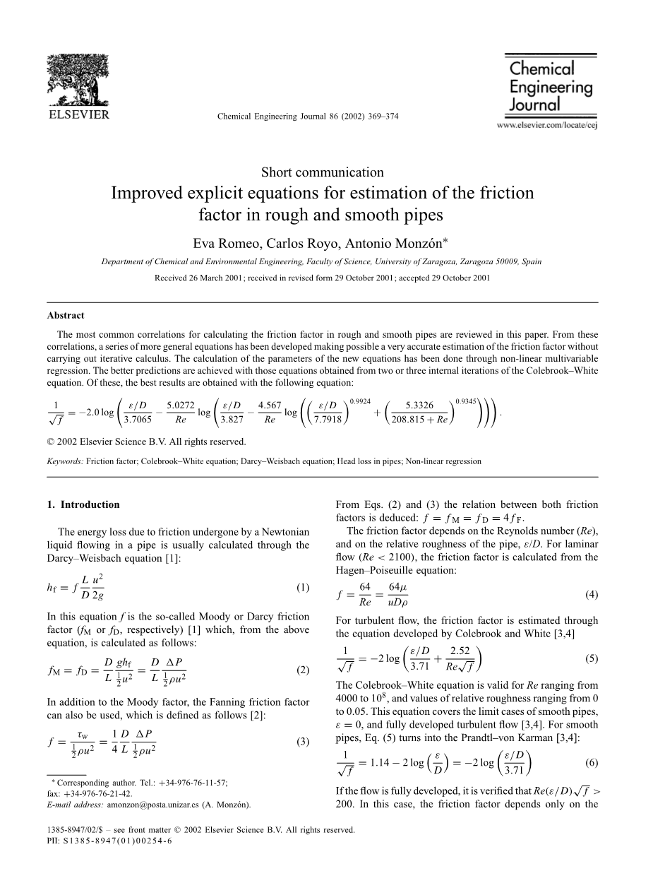 (xi)Manadilli [18]使用他所谓的类似于信号的方程式,提出了以下表达式,该表达式对Re的有效范围是5235至108,并且适用于任何ε/ D值: