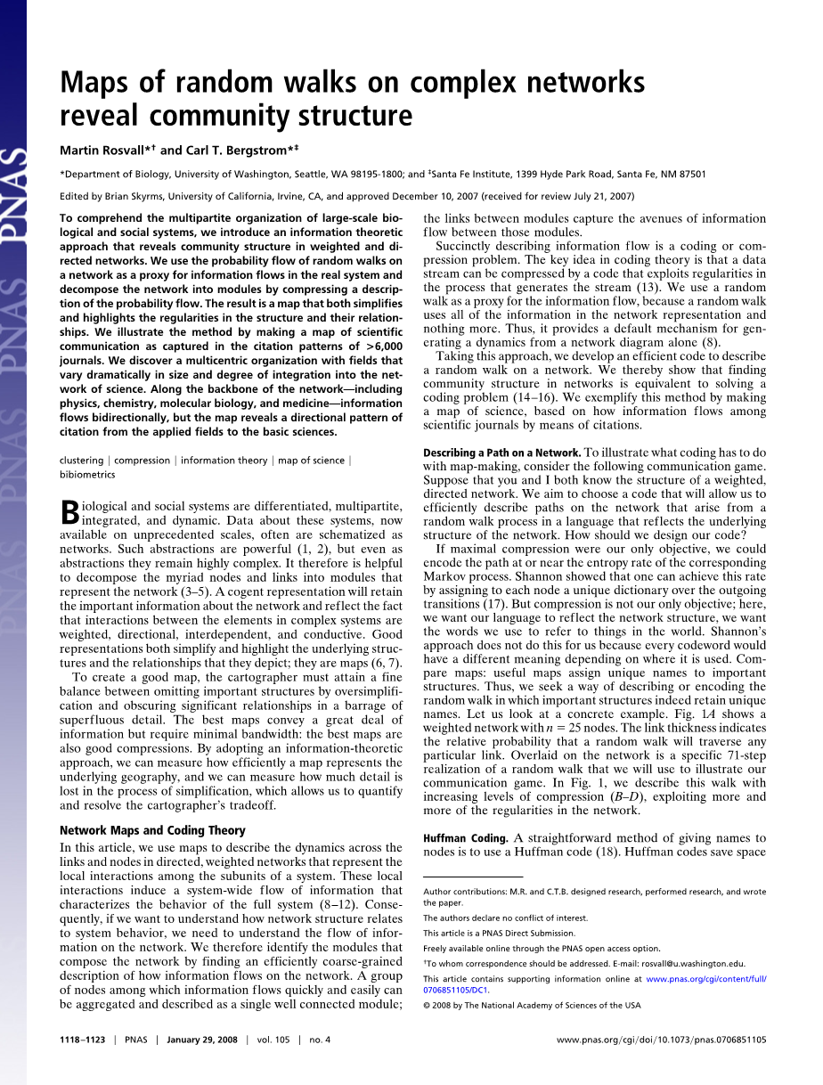 为了理解大规模生物学和社会学系统的多部分组织结构,我们引入一种信息论方法,该方法揭示了加权有向网络的社团结构。我们用在网络中随机游走的概率流代表真实系统中的信息流,并且通过简化概率流的描述将网络分解为各个模块。产生的结果是一种同时简化和突出结构上的规律性和各模块之间关系的示意图。我们在超过6000个杂志的引用形式中提取产生了一幅科学交流示意图,由此阐述了该方法。我们发现了一个多中心的组织结构,它的各个领域在规模上和在科学网络的整合程度上都有很大的不同。顺着网络主干——包括物理学、化学、分子生物学和药学——信息双向流动,但是该示意图揭示了从应用领域到基础科学的引文有向性模式。