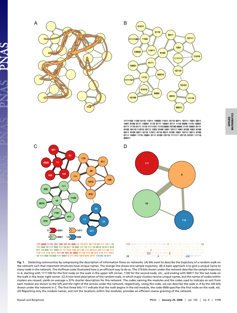 采用这种方法,我们开发了一种有效的代码来描述网络上的随机游走。进而我们展示了在网络中寻找社团结构等价于解决编码问题(14-16)。我们通过构造一张科学示意图,来举例说明这个方法,它基于科学期刊上通过引用产生的信息流。