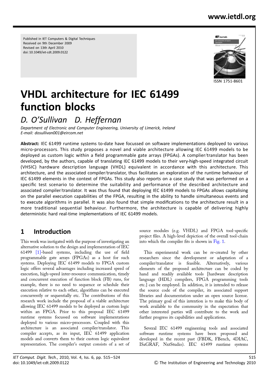 摘要:迄今为止,IEC 61499运行时系统专注于部署到各种微处理器的软件实现。本研究提出了一种新颖且可行的架构,允许在现场可编程门阵列(FPGA)中将IEC 61499模型展开为定制逻辑。作者开发了一个编译器/转换器,能够将IEC 61499模型转换为符合该体系结构的等效的超高速集成电路(VHSIC)硬件描述语言(VHDL)。这种体系结构以及相关的编译器/转换器可以帮助您深入了解IEC 61499元素在FPGA环境中的运行时行为。本研究还报告了在特定测试场景中执行的案例研究,以确定所描述架构和相关编译器/译码器的适用性和性能。因此,发现将IEC 61499模型部署到FPGA允许利用FPGA的并行执行能力,从而能够处理同时事件并且并行执行算法。还发现对该体系结构的简单修改导致更传统的顺序行为。此外,该架构还能够提供IEC 61499模型的高度确定性的硬实时实现。