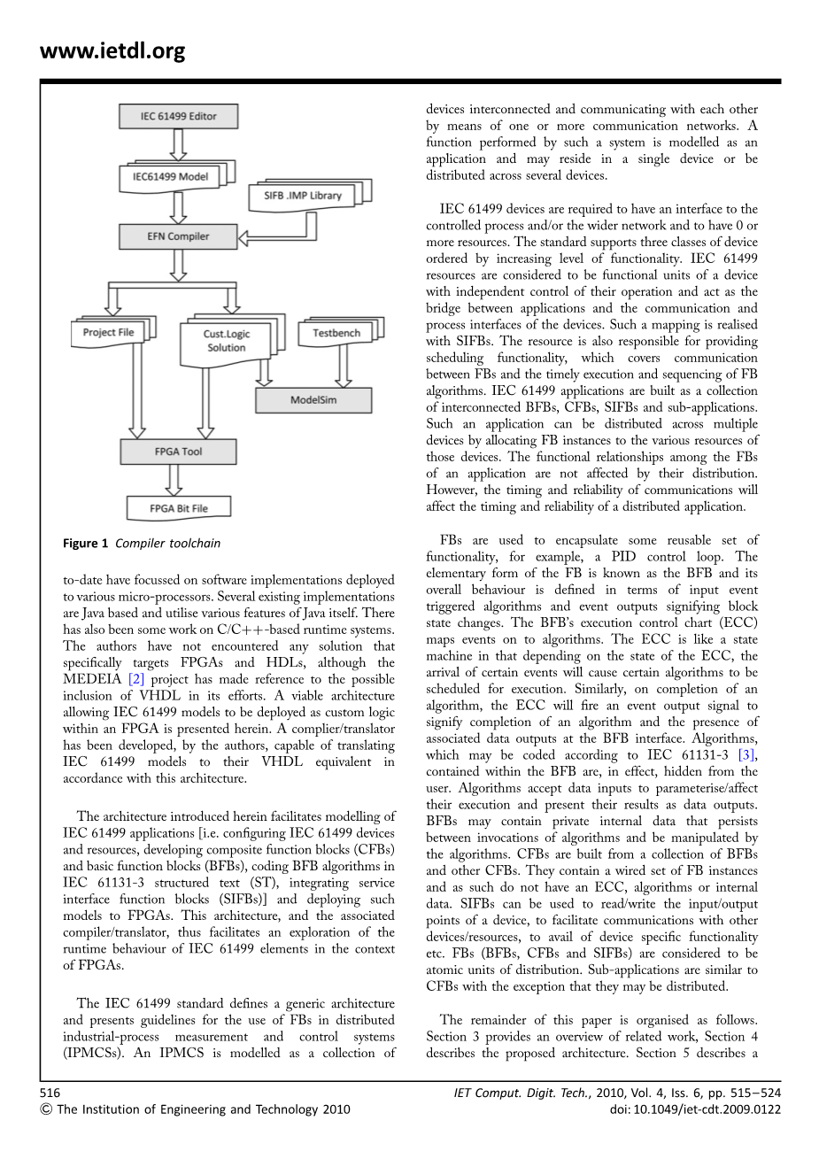 此项研究工作的目的是研究设计和实施基于IEC 61499的系统的替代解决方案,包括使用现场可编程门阵列(FPGA)作为此类系统的主机。定制逻辑提供了几个优点能使IEC 61499模型有效的利用到FPGA,包括增加执行速度,高速资源间通信,功能块(FB)运行的及时和并发执行,例如,无需对其执行进行排序或计划,算法可以同时执行或按顺序执行等。这项研究工作的贡献包括提出一种可行的架构,允许IEC 61499模型作为FPGA内的定制逻辑进行利用。在此提案之前,IEC 61499运行时系统主要被利用到各种微处理器的软件中。加上这个架构是一个关联的编译器/转换器。该编译器接受IEC 61499应用模型作为其输入,并将其转换为其自定义逻辑等效表示。编译器的输出由一组源模块(例如VHDL)和FPGA工具特定的项目文件组成。图1显示了编译器适合的整个工具链的高级描述。