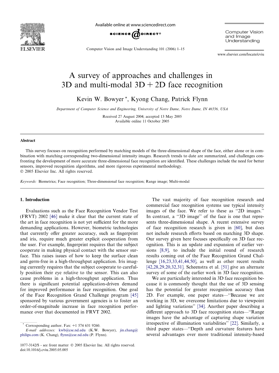 这项调查的重点是通过匹配脸部三维形状的模型来识别人脸,或者是单独的二维强度图像的组合。目前的研究趋势已经有所总结,现在对更精确的三维人脸识别的发展提出了挑战,包括对更好的传感器,改进的识别算法以及更加严谨的实验方法。