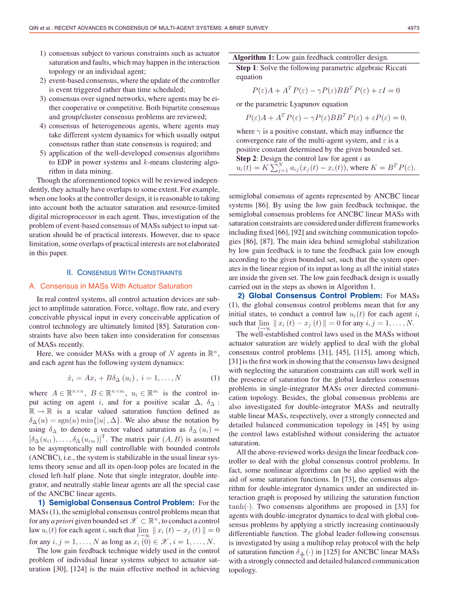 [124],是实现用ANCBC线性系统表示的个体的半全局一致的有效方法[86]。利用低增益反馈技术,在包括固定[66], [92]和切换通信拓扑[86], [87]在内的不同框架下,考虑了具有饱和约束的ANCBC线性多个体系统的半全局一致性问题。通过低增益反馈来实现半全局稳定的主要思想是根据给定的有界集来调整反馈增益的程度,这样,系统在输入的线性区域中运行,只要初始状态都在给定的集合内。低增益反馈设计通常在如算法1所示的步骤下执行。