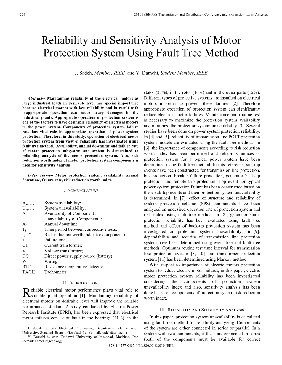 基于故障树分析的电机保护系统的可靠性与灵敏度分析外文翻译资料