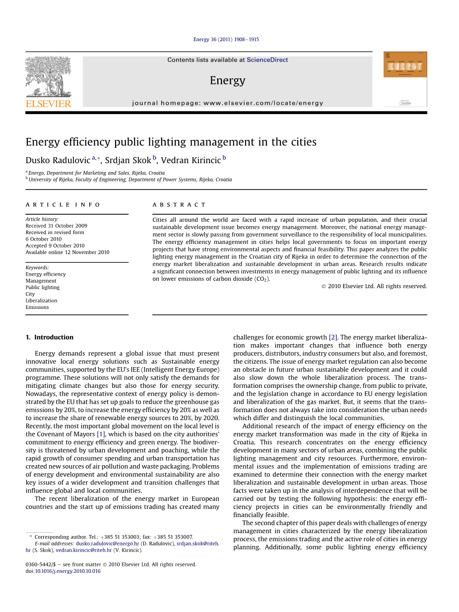 目前,克罗地亚共和国的能源效率活动和项目被认为在可持续发展和能源消费规划事关国家中优先。开发计划署(联合国开发计划署)在克罗地亚政府的支持下,在克罗地亚组织的“克罗地亚共和国各县市能源管理”项目于2006年初开始实施。该项目表明,没有当地社区的支持,相关的能源消费行为的变化不能实现。基于克罗地亚的节能效率和可再生能源的项目,里耶卡市已经在光伏、热电联产等能源效率项目[ 29 ]取得经验。上世纪80年代的一个工业城市,位于亚得里亚海北部,人口约150000人,目前正经历经济转型。由于能源需求(燃气、供热、公共照明等)和能源的实际情况的完全不均衡,2003市政府决定让民营资本进入公用事业公司埃那勾。这是克罗地亚一家公用事业公司的私有化,但里耶卡市仍然是该公司的大股东,持有公司56.9%的股份。自那时以来,里耶卡市已启动可持续发展能源规划,结合未来项目的财务可行性。几个节能效率项目在里耶卡市已经被实现,甚至在克罗地亚刺激节能效率新法律通过之前。本文将给予里耶卡市的公共节能照明项目的综合分析。