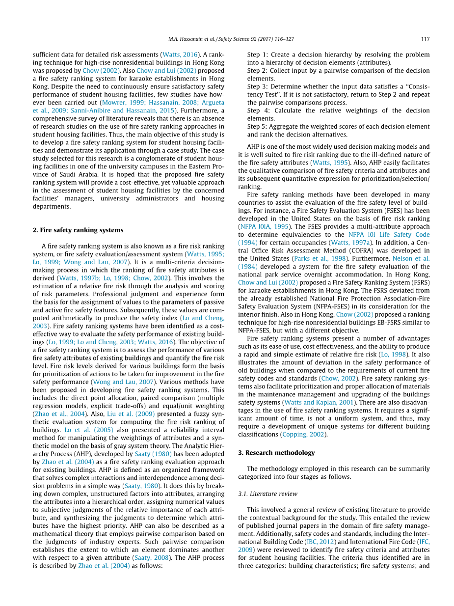 这涉及到对现有文献的综合评述以提供研究的背景背景。这需要对消防安全管理领域发表的期刊论文进行审查。此外,安全规范和标准,包括国际建筑规范(IBC,2012)和国际消防规范(国际金融公司(IFC) 2009)进行了审查,以确定学生住房设施的消防安全标准和属性。这样确定的标准分为三类:建筑特征; 消防安全系统; 和管理和维护。所确定的属性根据这三个标准分类。 该评估还提供了对现有消防安全评级系统的见解。