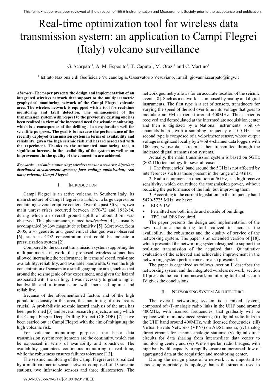摘要 - 本文介绍了支持Campi Flegrei火山区多参数地球物理监测网络的综合无线网络的设计和实施。 无线网络配备了用于实时监控和故障检测的工具。 鉴于对地震监测的需求日益增加,这是传输系统相对于之前现有传输系统的增强,这是为科学目的钻探探测井的结果。 考虑到与实验相关的高地震风险和危害,其目标是提高最近部署的传输系统在可用性和可靠性方面的性能。 由于采用了自动化监测工具,系统的可用性显着增加,并且连接质量得到了改善。