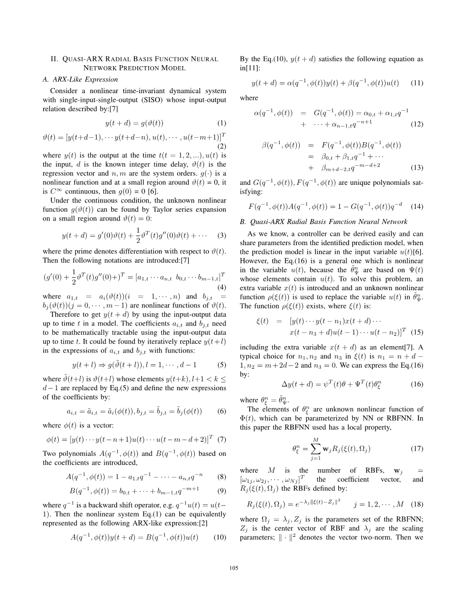 其中 Omega;j = lambda;j, Zj是RBFNN的参数集;Zj 是RBF的中心矢量,lambda;j是缩放参数; 1·1 表示向量两范数。那么我们可以用下面的形式表示方程(18)的准ARX RBFNN预测模型::