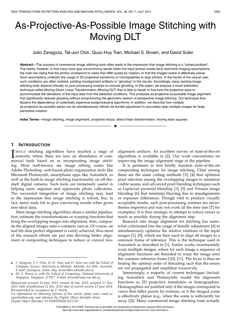 摘要:商业图像拼接软件的成功常常让人们以为图像拼接是一个“已解决的问题”。然而,事实上,当输入的照片违反了相当严格的成像假设,尤其是这些照片是纯粹因旋转而不同的视图,或者图像场景实际上是平面时,许多软件给出的结果并不令人满意。 这些假设是2D投影变换或基于单应性的图像拼接的基础,但在临时用户的手中,这些条件经常被违反,从而产生未对准的图像或结果中的“鬼影”。因此,许多现有的图像拼接软件严重依赖于后处理程序来隐藏鬼影.。本文提出了一种新的技术:移动直接线性变换,简称DLT。 它能够调整或微调投影的变换,以适应输入数据与理想条件的偏差。能减少鬼影且不损害图像拼接的几何真实感。因此,此技术减少了对潜在昂贵的后处理算法的依赖。此外,我们还描述了如何利用光束平差法同时校正多个投影的变换,以精确地进行大全景图像拼接。