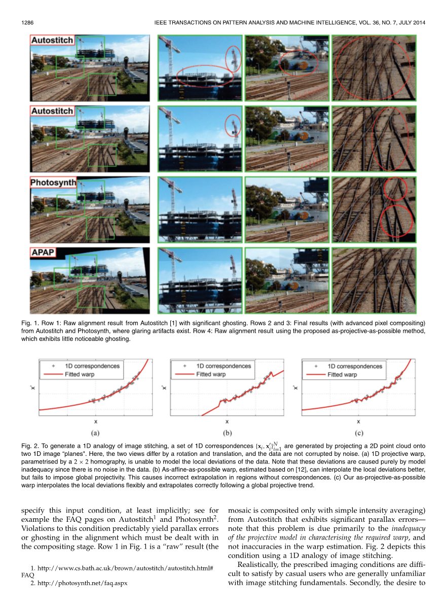 实际上,对于一般不熟悉图像拼接基本原理的普通用户来说,规定的成像条件是难以满足的。其次,当无法在所需的成像条件下重新访问场景时,才会想到要对图像进行拼接。不幸的是,许多最先进的技术,即使使用先进的像素合成或后处理,如果给出不合适的数据,也不能产生令人满意的结果。图1中的第2行和第3行是Autostich1和Photosynth2,的最终(后处理)结果,仍然存在明显的图像失真。