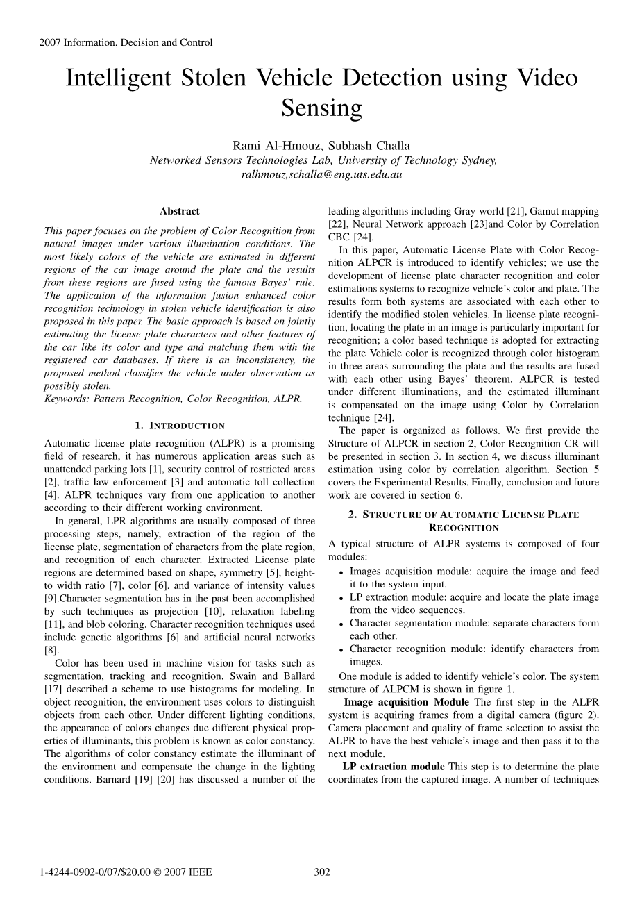 本文着重讨论了在各种照明条件下自然图像的颜色识别问题。 车辆最有可能的颜色是在车牌周围的汽车影像的不同区域估计的,并且这些区域的结果使用着名的贝叶斯规则进行融合。 本文还提出了信息融合增强彩色识别技术在被盗车辆识别中的应用。 基本方法是基于联合估计车牌字符和车辆的其他特征(如其颜色和类型)并将其与注册车辆数据库匹配。 如果存在不一致性,则所提出的方法将被观察的车辆归类为可能被盗。