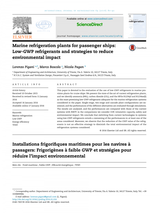 本文主要对低GWP制冷剂在邮轮船用给养装置中的应用进行了评价。我们介绍了当前制冷设备的技术现状,并确定氨(NH3)、二氧化碳(CO2)以及HFOs R1234yf和R1234ze(E)是最具发展前景的低GWP制冷剂,适用于本文所考虑的海洋制冷系统。对单级、两级和级联装置的结构进行了研究,并通过仿真对不同方案的性能进行了评价。对结果进行了分析,并与现有R407f系统的性能进行了比较:在比较中我们考虑了COP、容积容量、安全性和环境影响。我们的结论是,从目前的技术转向使用低gwp制冷剂的系统,至少会使所考虑的一个领域的性能恶化。此外,我们注意到,降低制冷剂的GWP值并不是减少所考虑的制冷系统的总环境影响的有效策略。