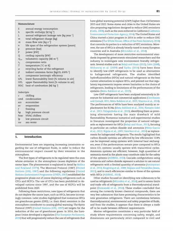 在这些限制之后,不消耗臭氧层的新型制冷剂,如氢氟碳化物,变得越来越普遍。后来的研究表明,许多氢氟碳化物是温室气体(GHG),即它们在大气中的直接排放导致全球变暖。《京都议定书》(1997)(联合国(UN), 1997)为减少温室气体的使用设定了目标。2014年,欧盟制定了一项计划(欧洲议会,2014),将逐步减少2015年至2022年间全球变暖潜力(GWP)超过150的制冷剂的使用。美国的一些州和城市也提出了旨在减少温室气体排放的法规(Calm,2008),比如加州的执法(California EnvironmentalProtectionAgency,2014)。美国和中国在2014年启动了一项旨在减少温室气体排放的联合项目(白宫新闻秘书办公室,2014年),该项目致力于促进氢氟碳化合物的排放。此外,氢氟碳化合物的使用已经在许多欧洲国家和澳大利亚课以重税(McLinden et al., 2014)。