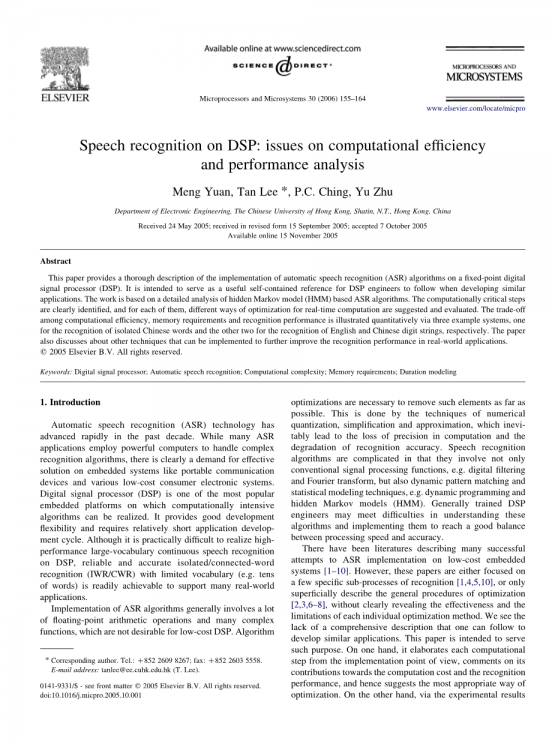 本文详细介绍了在定点数字信号处理器(DSP)上实现语音自动识别(ASR)算法的过程。它旨在为DSP工程师在开发类似应用程序时提供有用的参考。本文对基于隐马尔可夫模型(HMM)的ASR算法进行了详细的分析。明确了计算关键步骤,并针对每一个步骤提出了计算优化的不同方法。通过三个示例系统定量说明如何较好平衡计算效率、内存需求和识别性能,一个用于孤立中文单词的识别,另两个用于英语和汉语数字字符串的识别。本文还讨论了在实际应用中可以进一步提高识别性能的其他技术。