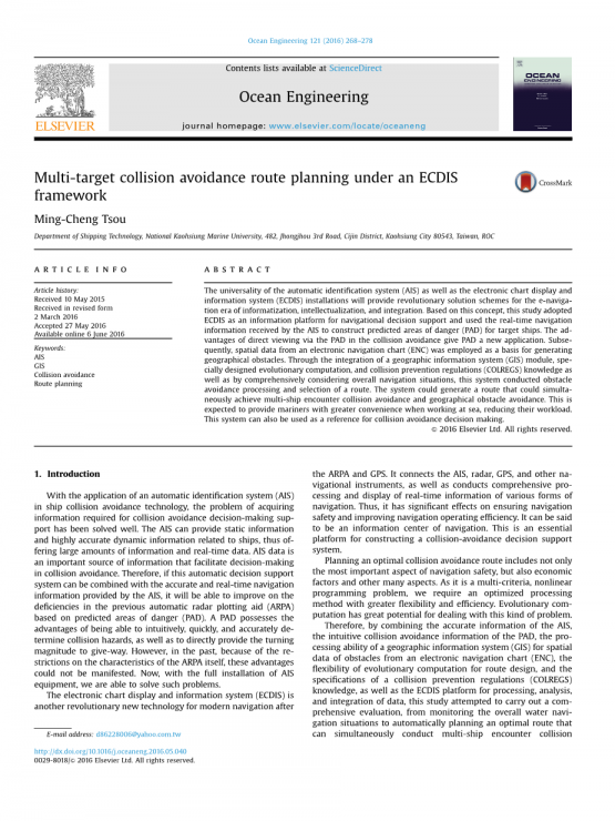 因此,通过将AIS提供的精确的信息,PAD提供的直观防撞信息,地理信息系统(GIS)对电子导航图(ENC)中障碍物空间数据的处理能力,进化计算对于路径规划问题的灵活性,防撞规则(COLREGS)知识的规范,以及用于处理,分析和整合数据的ECDIS平台相结合,本研究试图通过监测整体水上航行情况进行综合评估,自动规划可以同时避免多船遭遇碰撞和避免固定障碍碰撞的最佳路线。这一研究旨在为在海上工作的人员提供更大的便利,减少他们的工作量。同时,该系统也可以为船舶避碰决策的制定提供参考。具有很高的参考价值。