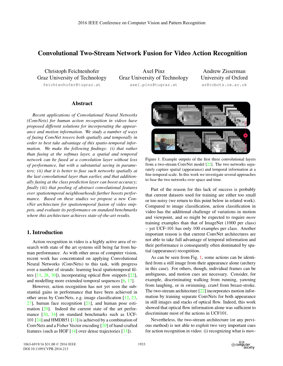 我们的目标是通过开发一种架构来修正这一问题,这种体系结构能够在特征抽象的几个层次上融合空间和时间线索,以及空间和时间的集成。特别地,Sec. 3调查了融合的三个方面:(1)在sec3.1 如何融合两个网络(空间和时间)考虑空间注册?(2)在sec3.2中在哪融合两个网络的?最后,在sec3.3(3)如何在时序上融合网络?在每一项调查中,我们都选择了最佳的结果(sec4),然后,将这些结果组合在一起,提出了一个新的架构(Sec.3.4),用于两个流网络的时空融合,从而达到了sec4.6的最先进的性能。