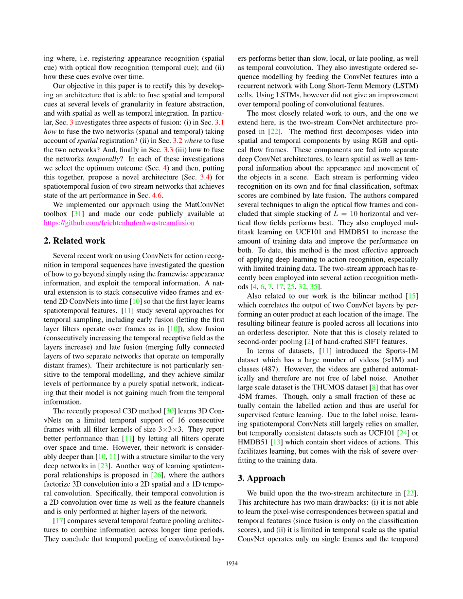 我们在【22】的双流架构上建立了基础。这个架构有两个主要缺点:(1)不能在空间和时间特征之间学习像素级的对应关系(因为融合只是分类的分数上),(2)有限时间规模,因为空间卷积操作只在单帧上,时序卷积操作只在堆叠的L个时序相邻的光流帧上(例如L=10)。在视频中,【22】的实现通过在规则的空间采样上使用时间池,在一定程度上解决了后一个问题,但这并不允许对行为的时间演变进行建模。