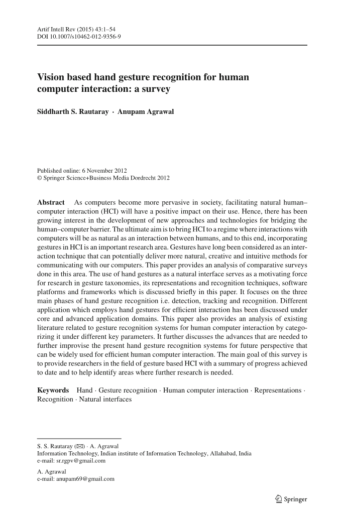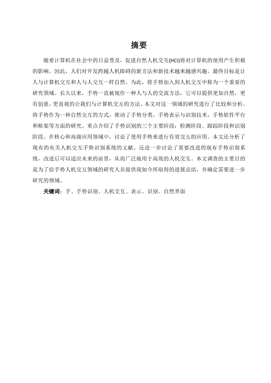 基于视觉的人机交互手势识别研究综述外文翻译资料 2022-08-09 15:41:55 英语原文共 54 页,剩余内容已隐藏,支付完成后下载完整资料 英语译文共 24 页,剩余内容已隐藏,支付完成后下载完整资料 资料编号:[239016],资料为PDF文档或Word文档,PDF文档可免费转换为Word 原文和译文剩余内容已隐藏,您需要先支付 30元 才能查看原文和译文全部内容!立即支付 发小红书推广免费获取该资料资格。点击链接进入获取推广文案即可: Ai一键组稿 | 降AI率 | 降重复率 | 论文一键排版 PREVIOUS NEXT 您可能感兴趣的文章 彩色图像中的人脸检测与识别外文翻译资料 一种非线性离散奇异大规模控制系统的稳定性外文翻译资料 融合领域特定和可训练的特征,用于人脸图像的性别识别外文翻译资料 ASP. NET概述外文翻译资料 基于深度卷积激活特性的地面云分类外文翻译资料 at89s52单片机简介外文翻译资料 实时多手势识别人机交互系统外文翻译资料 基于DTW改进算法的语音识别外文翻译资料 研究区域自动气象站的后端实时数据质量控制方法外文翻译资料 电动汽车的智能前车灯控制器设计外文翻译资料