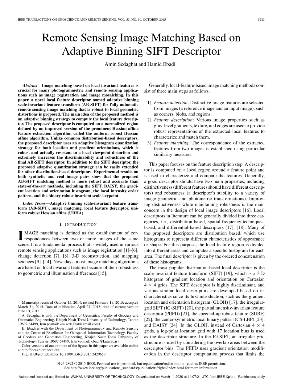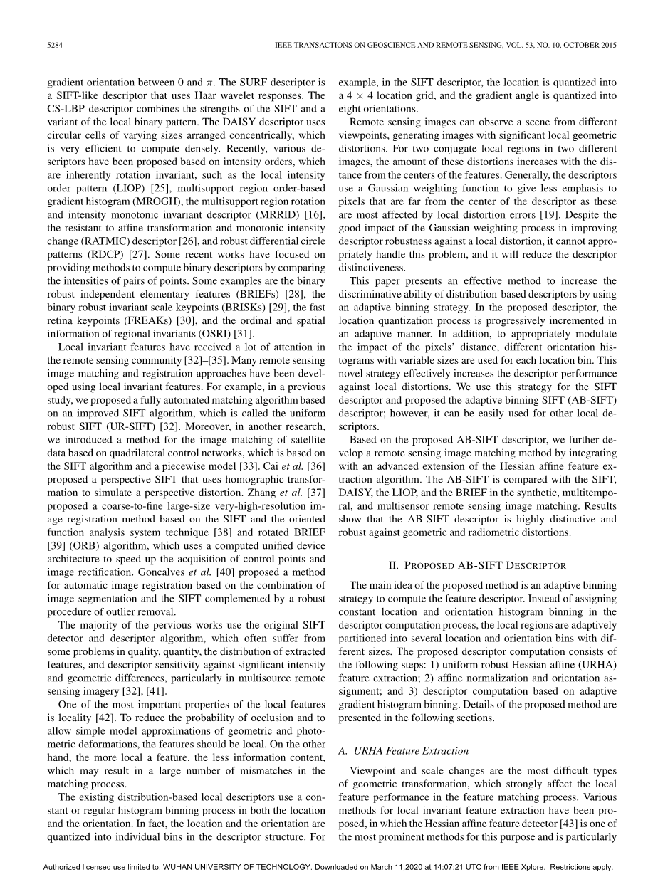 摘要:基于局部不变特征的图像匹配在很多方面有着重要的应用,尤其是在摄影测量和遥感领域,例如图像配准和图像镶嵌。本文提出了一种名为AB-SIFT的局部特征描述子用于遥感图像的全自动匹配,它对于局部的几何变形有很强的鲁棒性。该方法的主要思想是利用一种自适应合并策略去计算局部特征描述子,该描述子在一个归一化区域上计算。该描述子是在一个归一化区域上进行计算的,该区域是由著名的Hessian仿射特征提取算法(称为统一鲁棒Hessian仿射算法)的改进版本定义的。和常见的基于分布的描述子不同,该描述子对于位置和梯度方向都使用了自适应直方图量化的方法,该方法具有鲁棒性且可以对抗局部视点失真,并极大地提高了AB-SIFT描述子的可分辨性和鲁棒性。除了SIFT描述子外,所提出的自适应量化策略还可以轻松地扩展到其他基于分布的描述子。 在合成的和真实图像对上的实验结果表明,所提出的AB-SIFT匹配方法相比于当前最先进的(state-of-the-art)SIFT,DAISY,梯度位置和方向直方图,局部强度阶模式和二元鲁棒不变尺度关键点等方法有着更好的鲁棒性和准确度。