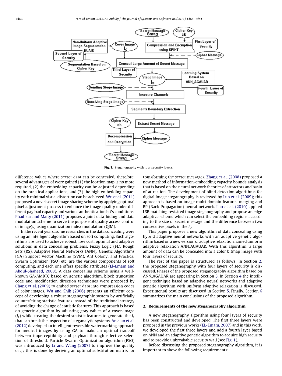 利用四层安全法构建和开发了一种新的稳分法算法。前三层被提出在前一项工作(EL-Emam,2007年),在这项工作中,我们开发了前三层,并增加了一个基于ANN的第四层和自适应遗传算法,以获得高安全性并提供牢不可破的安全墙(参见图1)。