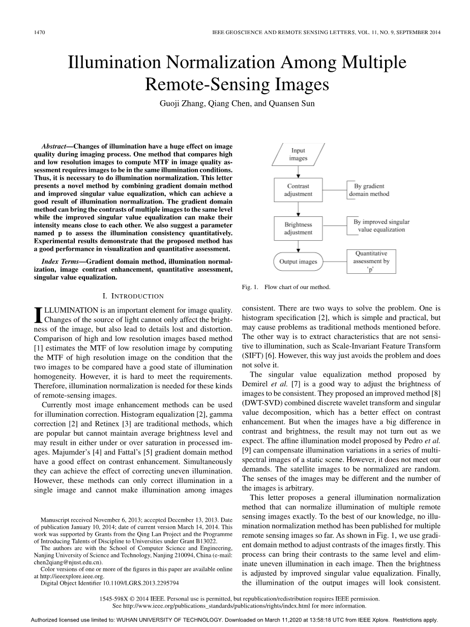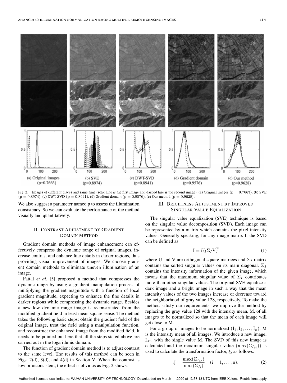 本文提出了一种通用的光照归一化方法,可以对多幅遥感图像的光照进行精确的归一化。据我们所知,目前还没有针对多幅遥感图像的光照归一化方法。如图1所示,我们首先使用梯度域方法来调整图像的对比度。这个过程可以使它们的对比度达到相同的水平,并消除每个图像中的不均匀光照。然后通过改进的奇异值均衡来调整亮度。最终,输出图像的光照看起来是一致的。我们还提出了一个评估光照一致性的参数P。从而可以直观、定量地评价该方法的性能。