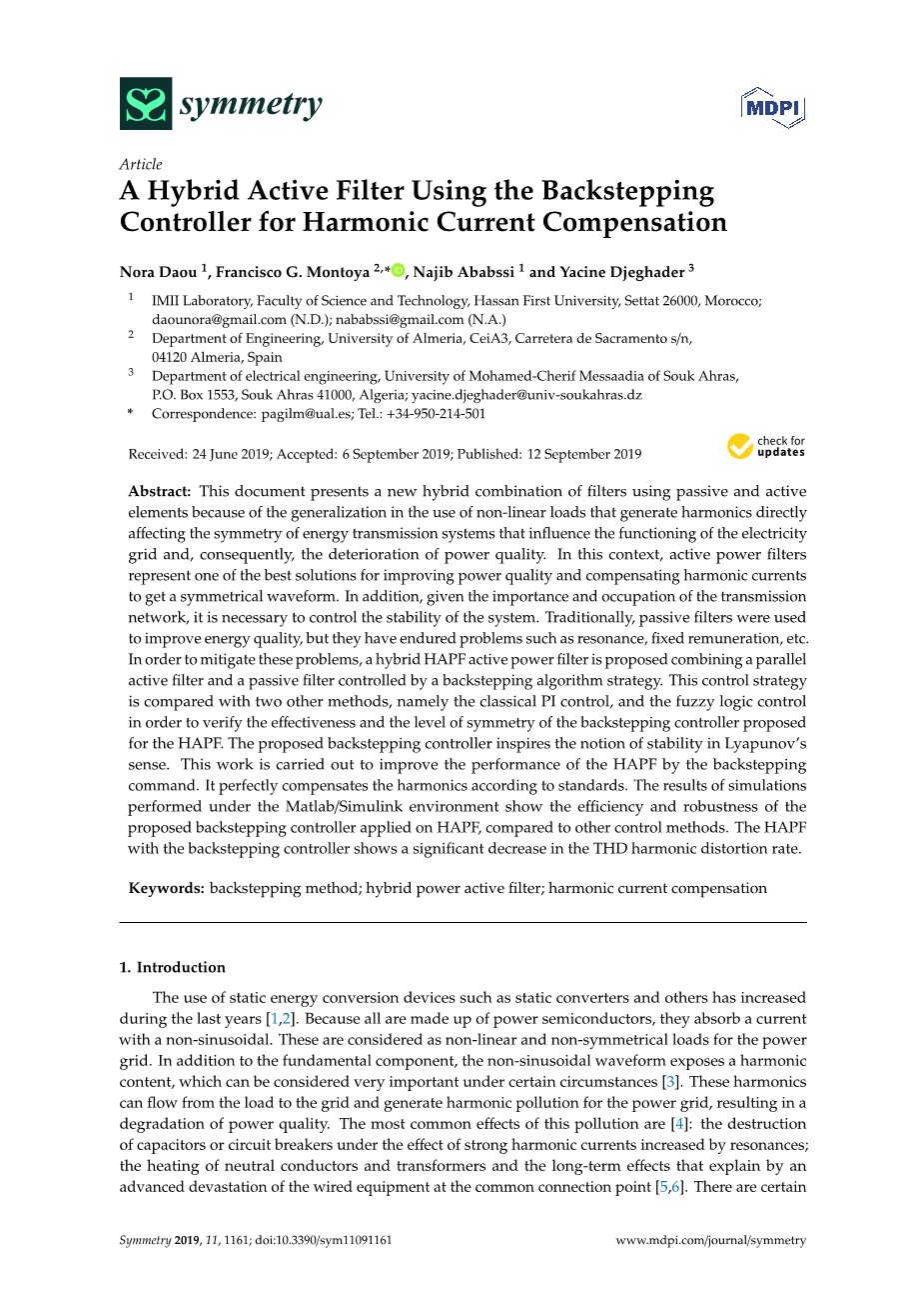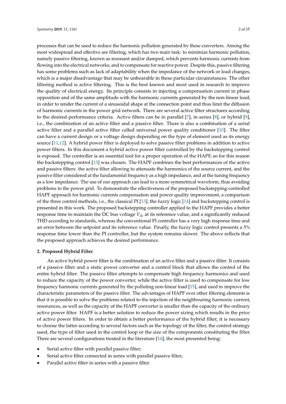 在过去的几年里,静态能量转换装置如静态转换器和其他装置的使用有所增加[1,2]。因为它们都是由功率半导体组成的,所以它们吸收的电流是非正弦的。这些被认为是电网的非线性和非对称负载。除了基波成分之外,非正弦波还暴露出谐波成分,这在某些情况下可以被认为是非常重要的[3]。这些谐波会从负载流向电网,并对电网产生谐波污染,导致电能质量下降。这种污染最常见的影响是[4]:在强谐波电流的作用下,电容器或断路器的损坏因共振而增强;中性导体和变压器的加热以及由公共连接点处有线设备的高级破坏所解释的长期影响[5,6]。有一些过程可以用来减少这些转换器产生的谐波污染。最广泛和最有效的是滤波,它有两个主要任务:最大限度地减少谐波污染,即被动式滤波,称为谐振和/或阻尼滤波,防止谐波电流流入电网;并补偿无功功率。尽管如此,无源滤波仍存在一些问题,例如当网络阻抗或负载变化时缺乏适应性,这是在这些特定情况下可能无法忍受的一个主要缺点。另一种过滤方法是主动过滤。这是最广为人知的,也是最常用于提高电能质量的研究。其原理是将补偿电流与非线性负载产生的谐波电流同时注入,以便电流在连接点处呈现正弦形状,从而限制谐波电流在电网中的扩散。根据所需的性能标准,有几种有源滤波器结构。有源滤波器可以并联[7],串联[8],或混合[9],即有源滤波器和无源滤波器的组合。还有串行有源滤波器和并行有源滤波器的组合,称为通用电能质量调节器[10]。该滤波器可以具有电流设计或电压设计,这取决于用作其能量源的元件的类型[11,12]。除了有源电力滤波器之外,还部署了混合电力滤波器来解决无源滤波器问题。在本文中,提出了一种由反步控制控制的混合有源电力滤波器。控制器是HAPF正常运行的重要工具,因此选择了反推控制器。HAPF结合了有源滤波器和无源滤波器的最佳性能:有源滤波器允许衰减源电流的谐波,无源滤波器在基频时被视为高阻抗,在调谐频率时被视为低阻抗。采用这种方法可以产生使电网波形更加对称,从而避免电网出现问题。为了证明所提出的反步控制谐波电流补偿和电能质量改善的HAPF方法的有效性,本文比较了三种控制方法,即经典PI [13]、模糊逻辑[14]和反步控制。应用于HAPF的反推控制器提供了更好的控制效果,响应时间保持直流总线电压Vdc在其参考值,并根据标准显著降低了总谐波失真,而传统的PI控制器具有非常高的响应时间和设定点与其参考值之间的误差。最后,模糊逻辑控制的响应时间比PI控制器低5%,但系统仍然较慢。以上反映了所提出的方法达到了期望的性能。