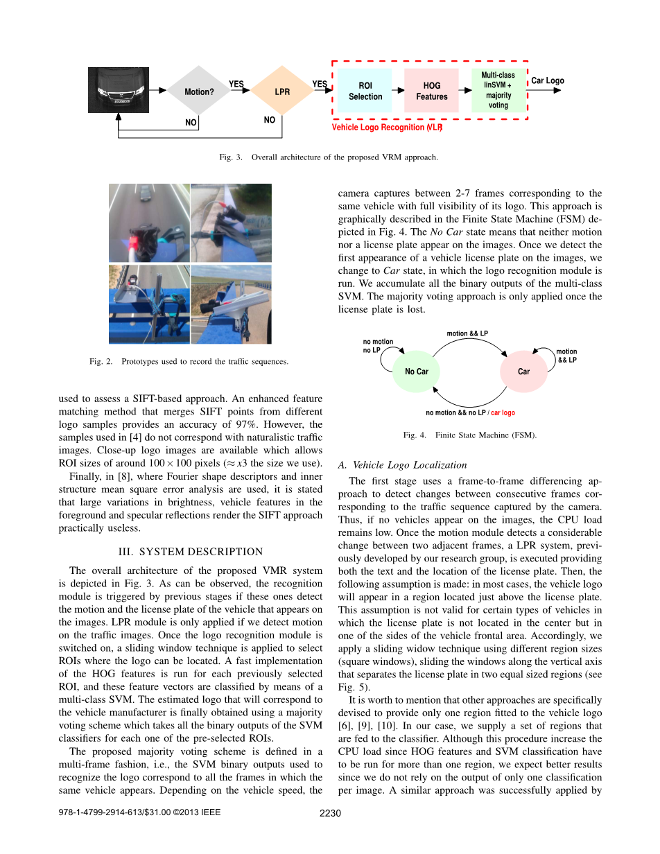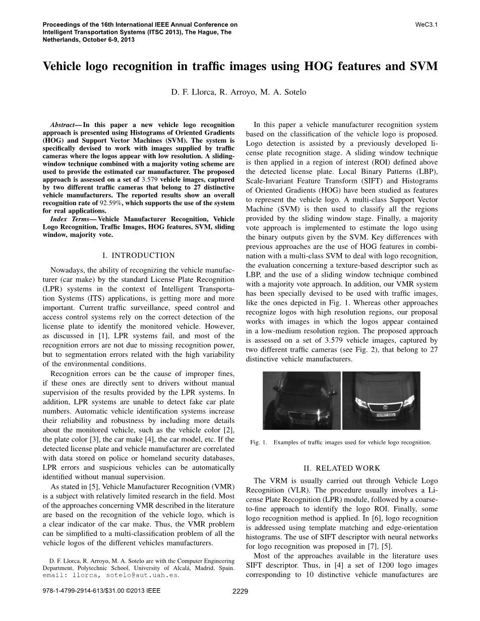 提出了一种利用交通摄像头采集的图像进行车辆标志识别的HOG/SVM框架。以前的方法主要是基于SIFT特征的使用,而在车辆标识无法获得高分辨率的情况下,SIFT特征并不适用。标志的梯度分布是一种有效的方法用来描述符的标志分类,而其他功能,如基于纹理(LBP)无法提供更好的结果。滑动窗口技术提供了一组roi,将其提供给分类器。多数表决方法报告良好的结果,特别是当多个图像可用于一个特定的车辆。线性核函数的计算结果优于径向基函数。这一结果得到了线性核作为在线分类器时速度的提高。此外,通过为车辆的每个图像创建新样本来增加训练样本的数量,报告了相当大的性能改进。