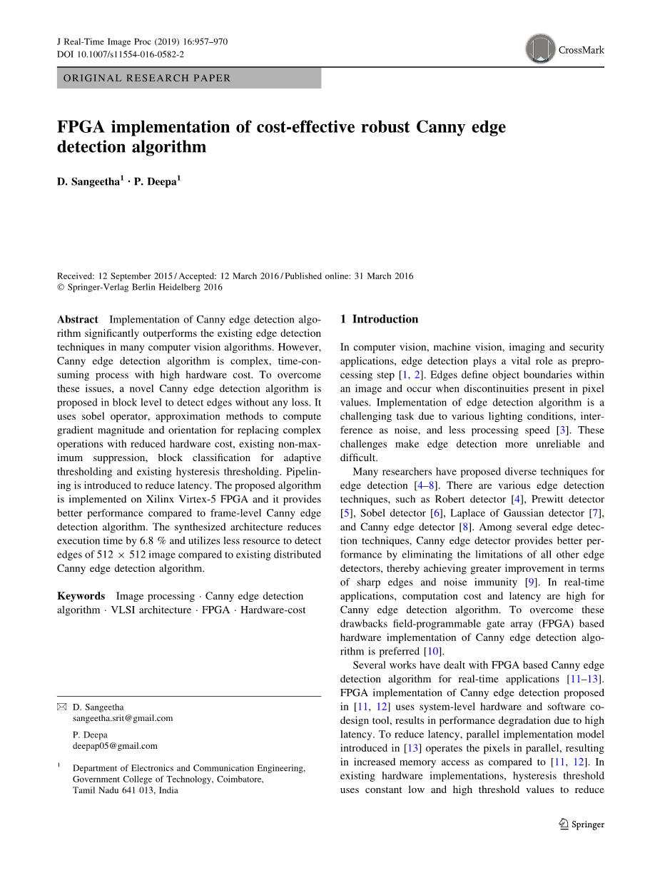在目前现有的计算机视觉算法中,Canny边缘检测算法明显优于许多边缘检测技术。但是,Canny边缘检测算法实现复杂,计算耗时长且资源占用高。为了克服这些问题,本文提出了一种新颖的Canny边缘检测算法,该算法在硬件层级上以相同的精度检测边缘。它使用Sobel算子,并使用近似法来计算梯度值和方向,降低算法的复杂度并以此降低硬件资源的使用,以实现非极大值抑制,自适应阈值的和现有的双阈值门限法。引入流水线级操作以减少延迟。该算法在Xilinx Virtex-5 FPGA上实现,与帧级Canny边缘检测算法相比,具有更好的性能。与现有的分布式Canny边缘检测算法相比,该合成架构将运算时间减少了6.8%,并能利用更少的资源来实现512times;512图像的边缘检测。