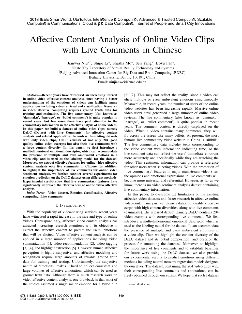 随着视频共享服务的普及,近年来在线视频的规模和类型迅速增加。相应地,情感视频内容分析引起了越来越多的研究关注,其目的是提取情感内容以预测将被引发的用户情绪。视频情感内容分析可应用于大量应用,包括视频摘要,视频推荐,视频标记和高亮提取。然而,人类情感感知是高度主观的,情感建模和识别需要大量可靠的地面实况数据用于训练和测试。不幸的是,“情绪”的主观性质使得难以收集一致且大量的情感注释,这些注释可以用作地面实况数据。虽然有很多关于视频情感内容分析的研究工作,但一个缺点是大多数研究都假设视频片段有一个主要情绪。这可能无法反映现实,因为视频可以同时引发多种甚至是矛盾的情绪。同时,近年来,在线视频网站的用户数量迅速增加。大量的在线视频用户已经产生了大量的在线视频评论。现场评论(也称为“弹幕”,“弹幕”或“子弹评论”)近年来非常流行。评论内容直接显示在视频上。当视频包含许多评论时,它们会像许多项目符号一样在屏幕上飞行。目前,中国最着名的现场评论视频网站是Bilibili。实时评论数据包括与具有指示时间的信息的视频内容相对应的文本,因此实时评论数据可以在他们正在观看视频时更准确和具体地反映用户的即时情绪。这种情绪信息可以在选择视频时为其他用户提供参考。随着主要主流视频网站中“现场评论”功能的推广,现场评论中的意见和情感表达将变得更加普遍和具有参考性。但是,据我们所知,没有包含实时评论信息的视频情感分析数据集。