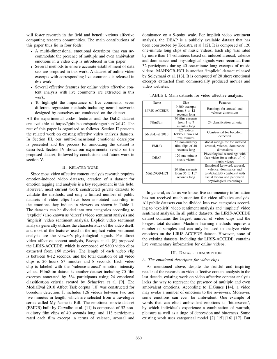 一般来说,据我们所知,现场评论信息对于视频情感分析并未引起太多关注。根据“显式”视频情感分析和“隐含”视频情感分析,所有公共数据集可分为两类。在所有公共数据集中,LIRIS-ACCEDE数据集包含最多数量的视频剪辑和最长的总持续时间。机器学习方法需要大量样本,并且只能用于分析LIRIS-ACCEDE数据集上的视频情绪。但是,现有的数据集(包括LIRIS-ACCEDE)都不包含在线视频的实时评论信息。