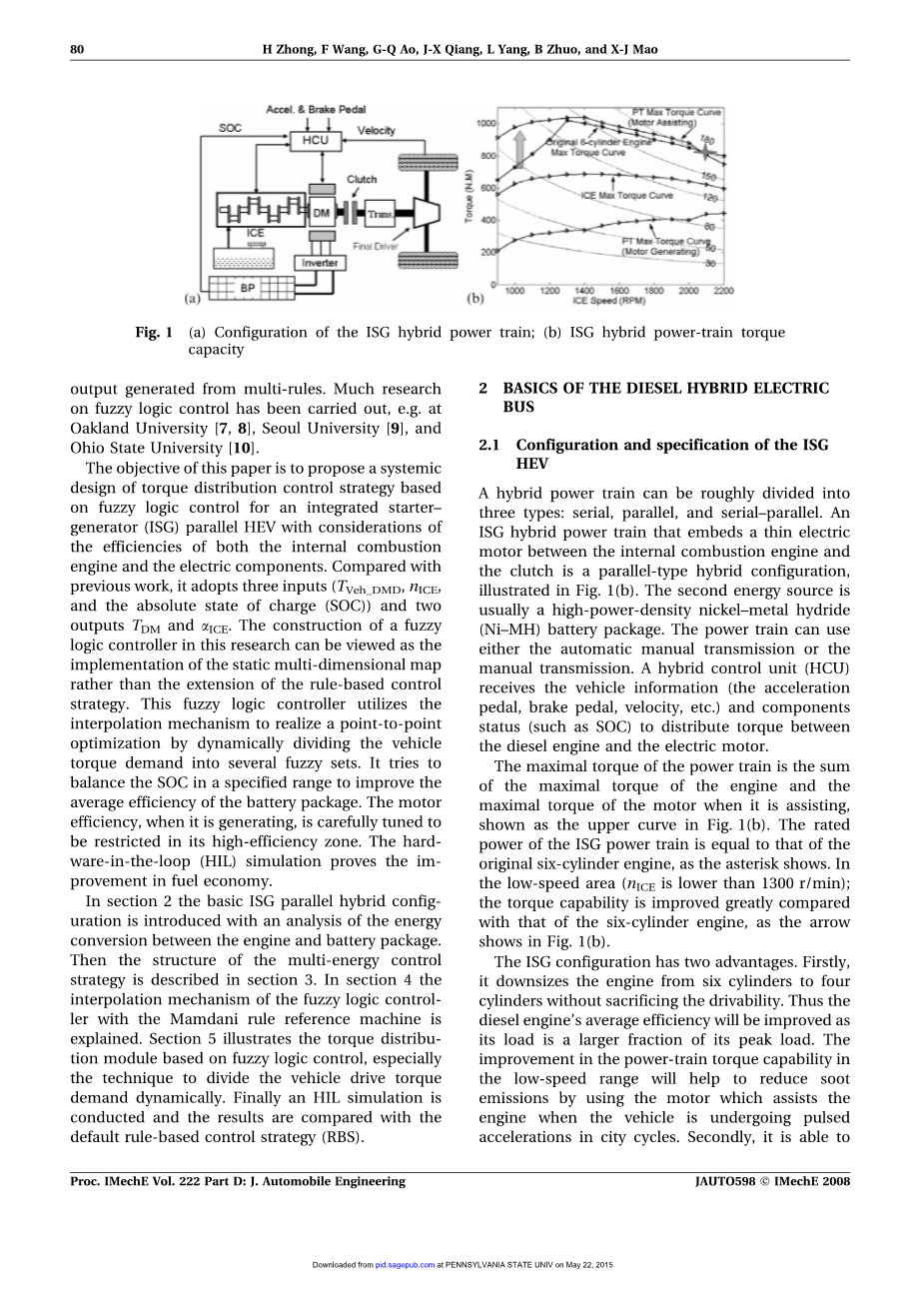 ISG结构具有两个优点。首先,它在不牺牲驾驶性能的情况下将发动机从六个气缸减小到四个气缸。因此,柴油机的平均效率将提高,因为其负载是其峰值负载的较大部分。在低速范围内,动力总成转矩性能的提升将通过使用电动机对减少烟尘排放有所帮助,该电动机可在车辆在城市循环中经历脉冲加速时辅助发动机。其次,因为其像传统的柴油发动机一样是整体组件,所以能够适应各种变速器以及简化动力总成的机械改造。这种并行配置的许多应用已经在汽车和公交上使用了,例如著名的本田IMA系统,欧洲大陆的ISAD和上海交通大学的ISG城市公交车[12]。