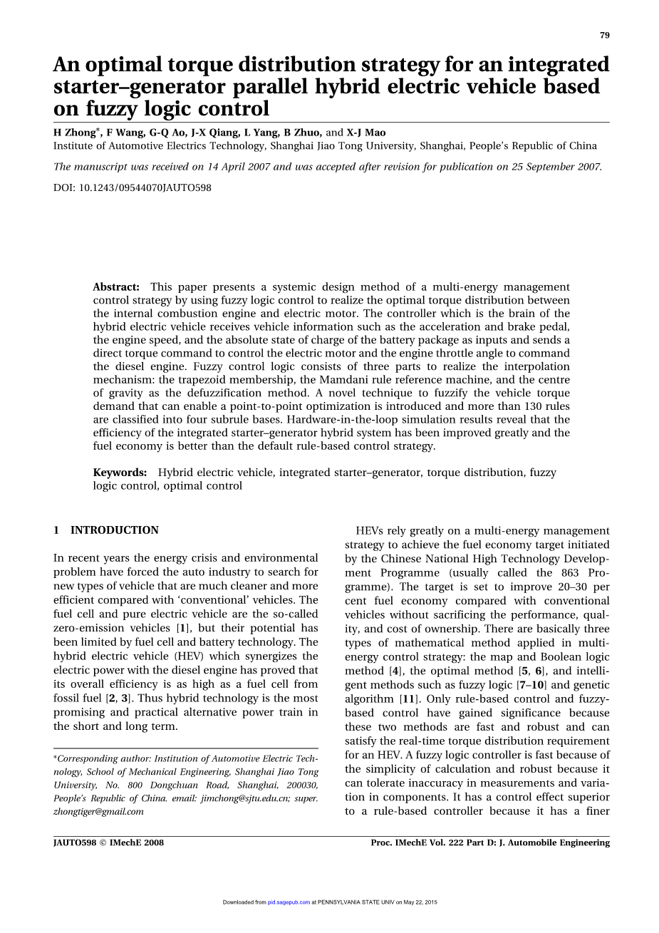一种基于模糊逻辑控制的起动-发动机并联混合动力汽车的最佳转矩分配策略