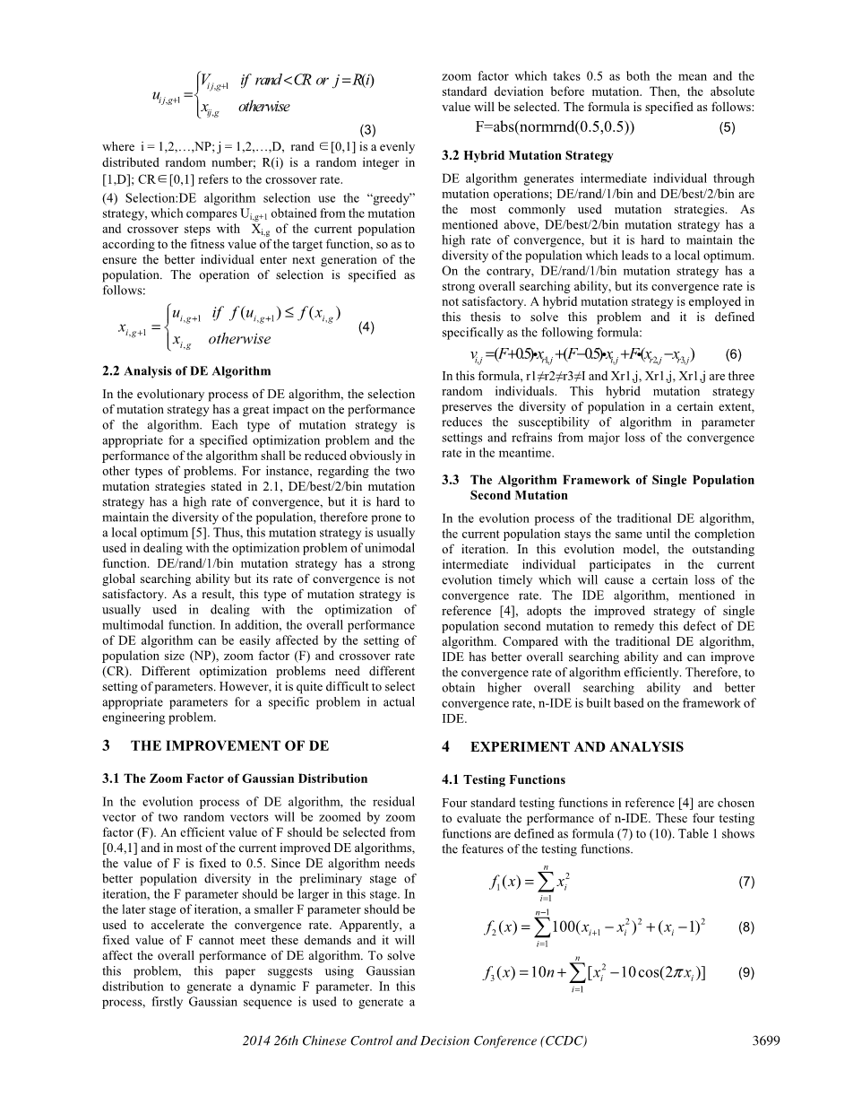 在DE算法的演化过程中,两个随机向量的差向量将被缩放因子(F)缩放。一个有效的F应从[0.4,1]中选择,在大多数当前改进的DE算法中,F的值固定为0.5。由于DE算法在迭代的初始阶段需要更好的种群多样性,因此在此阶段F参数应该大一些。在迭代的后期,需要一个较小的F值以便于加快收敛速度。显然,F的一个固定值不能满足这些要求,它将影响DE算法的整体性能。为了解决这个问题,本文建议使用高斯分布来产生一个动态的F参数。在这一过程中,首先利用高斯序列产生一个缩放因子,以0.5为变异前的均值和标准差,然后选择绝对值,公式规定如下。