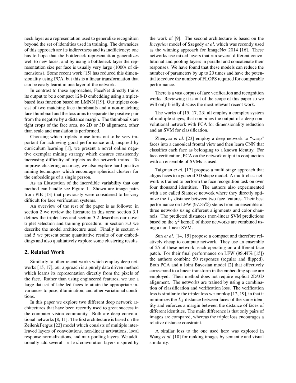 Sun等人[14,15]提出了一种紧凑且相对便宜的计算网络。他们使用了25个这样的网络,每个网络在不同的面部贴片上运行。对于他们在LFW(99.47%[15])上的最终表现,作者结合了50个回答(常规和翻转)。采用主成分分析和有效对应嵌入空间线性变换的联合贝叶斯模型[2]。他们的方法不需要显式的2D/3D对齐。该网络采用分类和验证损失相结合的方法进行训练。验证损失类似于我们使用的三元组损失[12,19],它最小化了相同身份的人脸之间的l2距离,并在不同身份的人脸之间建立了一个边界。主要的区别是,只有对图像进行比较,而三元组丢失鼓励了相对距离约束。