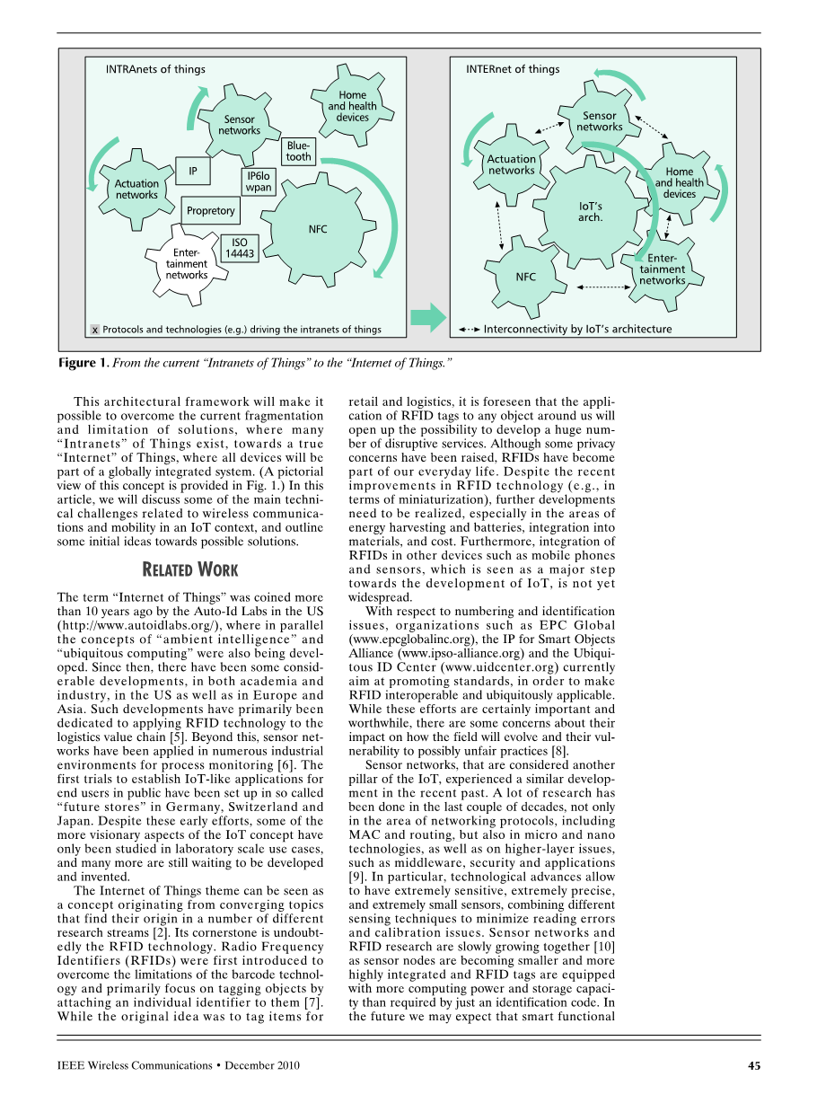 在这篇文章中,我们提出了物联网的现状,并讨论很多事情的“内联网”当前形势下应如何演变成一个更加综合和异构系统。我们也总结了在我们看来,什么是摆在面前的主要无线移动性相关的技术挑战,并概述了如何这些挑战可以以利于物联网的发展和接受未来几年需要解决的一些初步设想。我们还描述的物联网协议架构的案例研究。