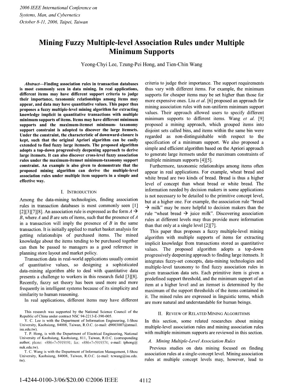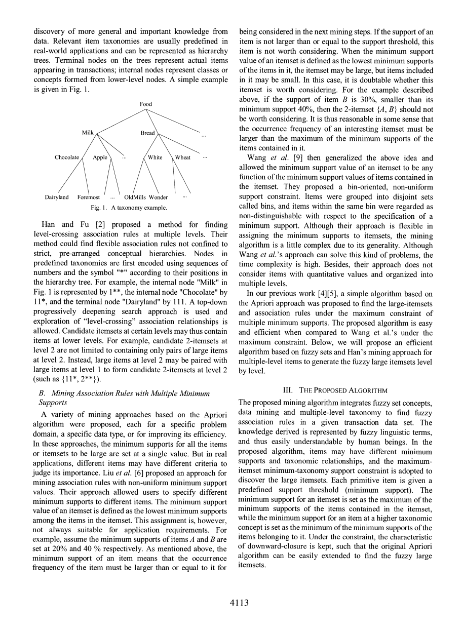 由于挖掘算法的一般性,它将最小支持分配给项集是一个复杂的过程。虽然王等人的方法可以解决这类时间复杂度高的问题。但是,他们的做法不考虑项目与数量的价值和组织多层次。在我们以前的工作[ 4 ] [ 5 ],一个简单的算法的基础上提出了寻找频繁项集的Apriori算法在最大约束下的关联规则中的多个最小支持。下面,我们将提出一个有效的基于模糊集和汉挖掘方法的算法多层次项目按等级生成模糊大项目集。