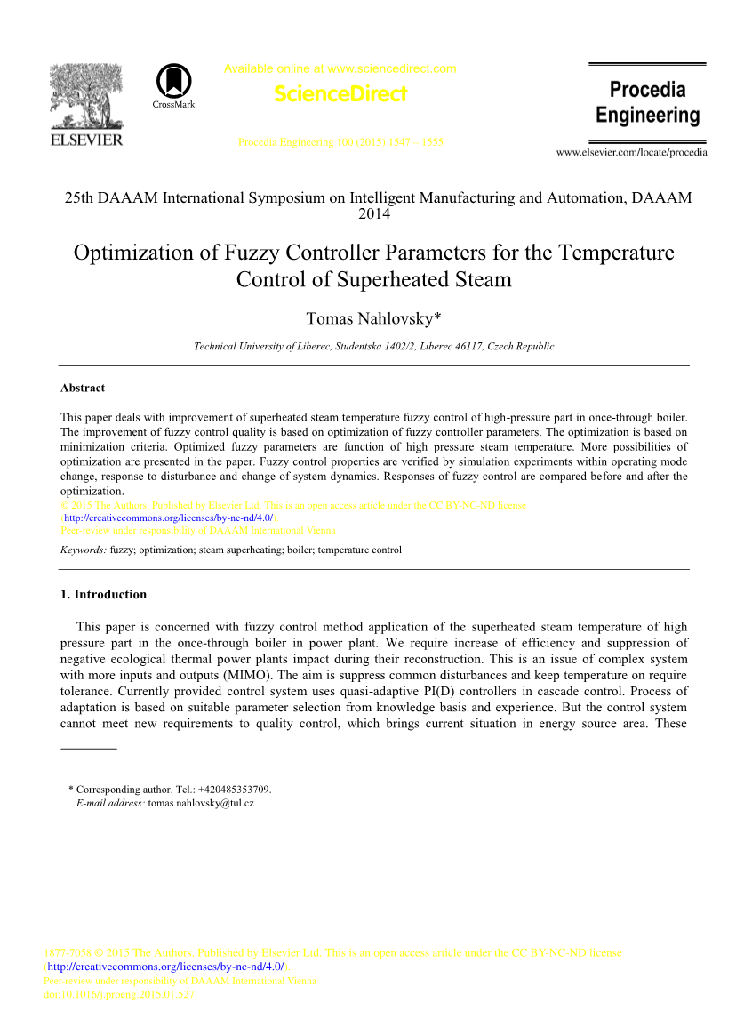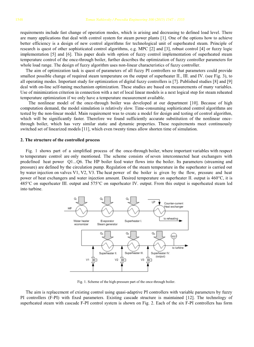 本文是关于模糊控制方法在电厂直流锅炉高压部分过热蒸汽温度控制方面的应用。我们需要提高效率和减少在重建生态热电厂过程中造成负面影响。这是一个复杂的系统问题。多输入多输出。其目的是抑制常见的干扰,保持温度要求。目前提供的控制系统采用quasi-adaptivePI(D)控制器级联控制。优化的过程适应是基于基础知识和经验选择合适的参数。目前,在能源领域,控制系统不能满足质量控制的新要求。这些需求包括运行模式的快速切换,提高和降低负载级别的定义。许多应用程序处理控制系统如蒸汽发电厂[1]。提高效率是设计过热蒸汽温度控制系统技术单元的一种原则。研究探索其他复杂的控制算法,如模型预测控制[2]和[3],鲁棒控制[4]或模糊逻辑实现[5]和[6]。选择模糊控制过热蒸汽来实现直流锅炉的温度控制,进一步描述了模糊控制器参数的优化负载范围和设计模糊控制器的模糊算法使用的非线性特征。