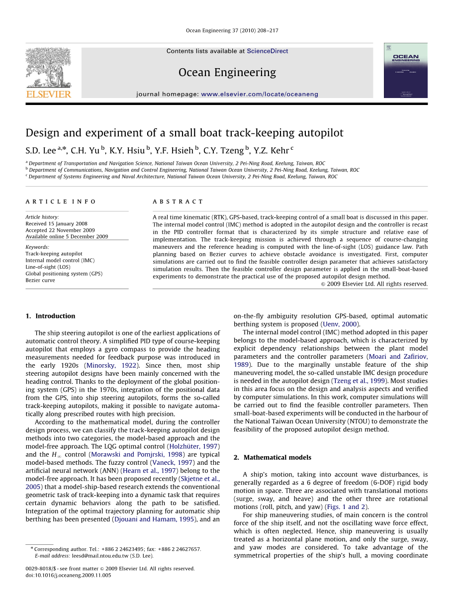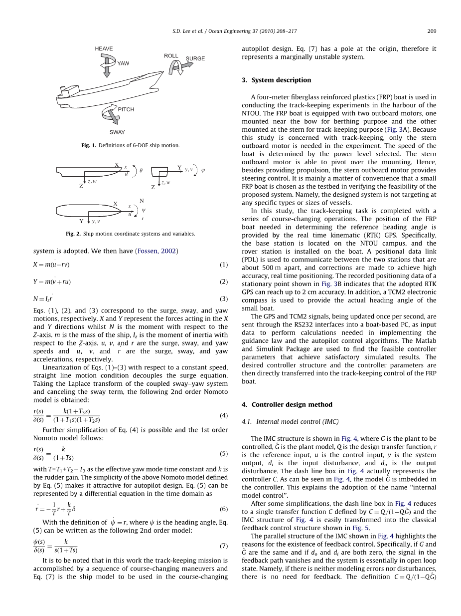 本文采用的内模控制(IMC)方法是基于模型的方法,其特点是设备模型参数与控制器参数之间的显式依赖关系(Moari and Zafiriov,1989)。由于船机动模型的临界不稳定的特征,所谓的不稳定控制器设计程序是在自动舵的设计中是必要的(Tzenget1999),大多数研究的重点都是在设计以及分析方面,并通过计算机仿真验证,在这项工作中,将进行计算机模拟,用来找到可行的控制器参数。然后基于小船的实验将在国立台湾海洋大学的港口进行并用来验证自动驾驶仪的设计方法的可行性。