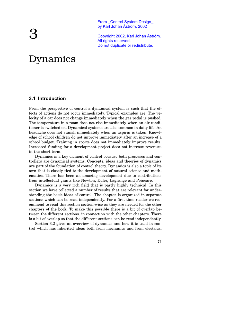 动力学是控制的一个关键因素,因为不管是过程还是控制都是动力系统。概念,思想和理论动态是控制理论最基础的一部分。动力学也自己的主题密切相关的自然科学的发展和数学学科的发展。这门学科由于知识巨人牛顿、欧拉、拉格朗日和庞加莱的贡献有一个惊人的发展。动力学是一个非常富有的部分高技术领域。在本节中,我们收集了大量的相关的结果对于理解控制的基本思想。本章被组织在不同的部分,可以独立阅读。我们建议读者第一次阅读本节因为它们所需的其他章节简介。这可能有一些重叠与其他章节的内容。有一些重叠的不同部分可以独立阅读。