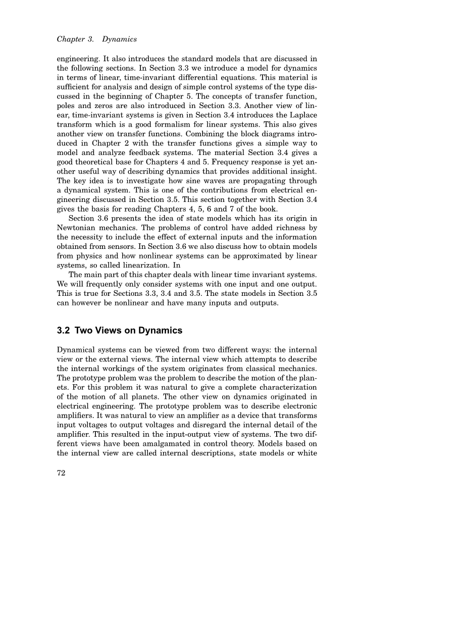 3.6节提出了状态模型的想法起源于牛顿力学。控制的问题增加了丰富的必要性包括外部输入的影响,从传感器获得的信息。3.6节中我们还讨论如何从物理获得模型和非线性系统可以用线性近似系统,所谓的线性化。在本章的主要部分处理线性时不变系统。我们将经常只考虑系统与一个输入和一个输出。这适用于部分3.3、3.4和3.5。在3.5节可以通过非线性状态模型和有很多的输入和输出。