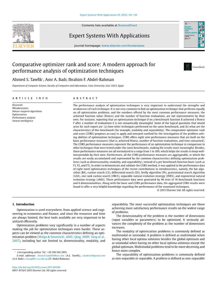 优化技术性能分析的两种最有趣和相关的平台是通过比较连续优化器(COCO)平台(“COCO,” 2015)实现的黑盒优化基准(BBOB)工厂和黑盒优化竞赛(BBComp) (“BBComp,” 2015),它们都采用了通过问题特征来表示性能结果的概念。BBOB和BBComp都是按照遗传和进化计算会议(GECCO)和IEEE进化计算国际大会(CEC)来组织的。它们集中了多种优化技术,这些技术通过了一系列限定在特定实验设定下的预置了包含不同特征(Hansen, Auger, Finck, amp;Ros, 2013; Lietal., 2013; Liang, Qu, amp;Suganthan, 2013)的基准函数的测试。性能结果在测试后通过表格或图形表示。这些结果可按一种特定的基准函数表示或按一组具有特定特性的基准(例如,维度或模态)表示。
