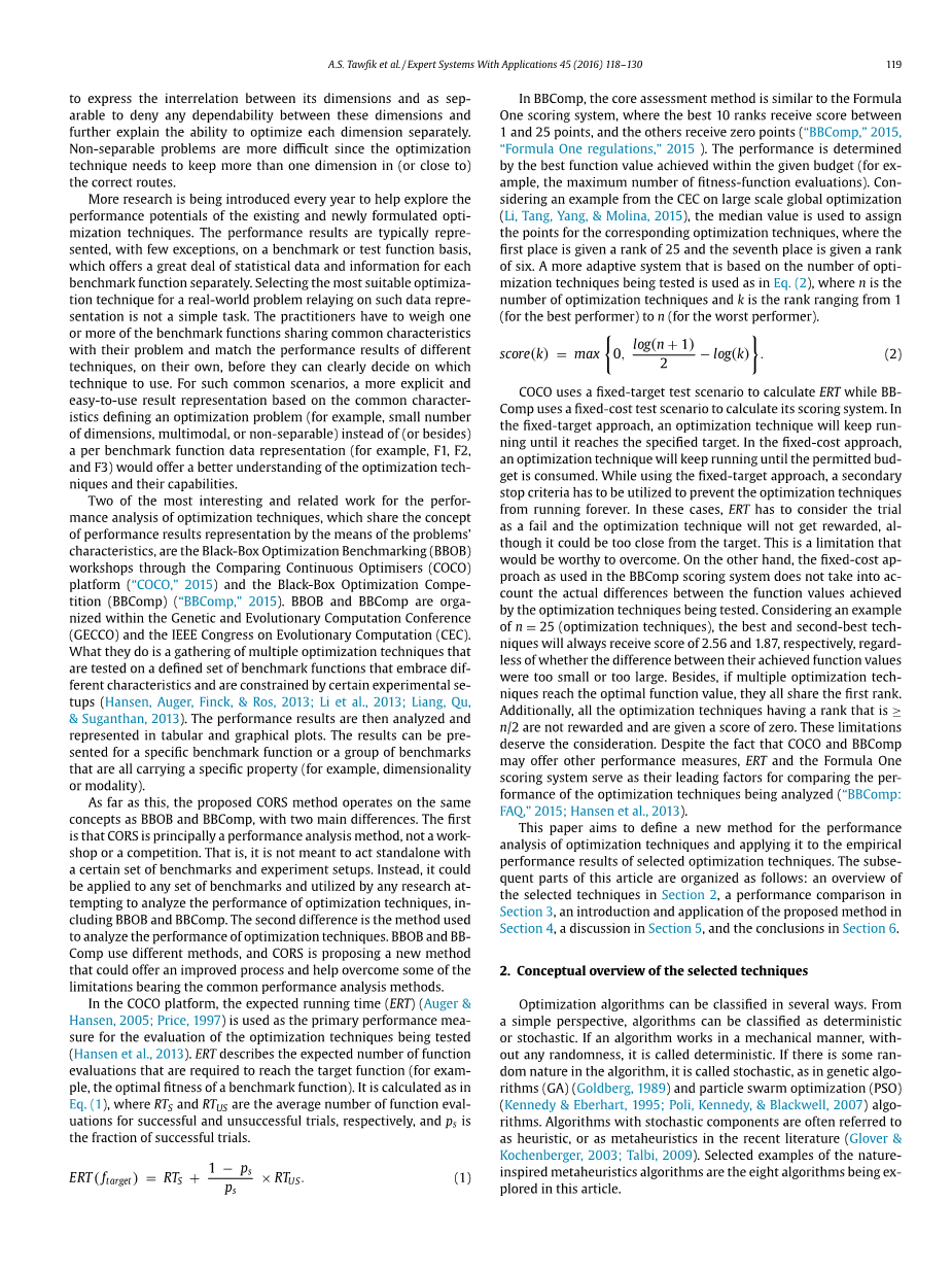 到目前为止,除了两个主要不同点外,CORS和BBOB及BBComp采用了相同的工作理念。第一个不同,CORS主要是一个性能分析方法,而不是一个分析平台。也就是说,它并不是脱离特定的基准和实验设定来工作。与之相反,它可以被应用到任何基准及分析优化技术性能的研究中,包括BBOB和BBComp。第二个不同是分析优化技术性能的方法。与BBOB和BBComp采用的方法不同,CORS提出了一种改进的可以克服常用性能分析方法的限制的新方法。